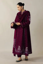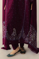 Our classic panelled long shirt showcases delicate Kashmiri embroidery in hues of blue. The outfit is completed with tapered shalwar and a Kashmiri-embroidered shawl, creating a harmonious blend of elegance and tradition.