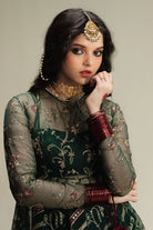 A green organza Anarkali crafted in three alternating panels, each showcasing a distinct embroidery pattern in resham and gold tilla. The hemline is finished with a scalloped border and tassel accents, adding a graceful yet playful detail. It is paired with a Korean raw silk lehenga highlighted with an embroidered border.