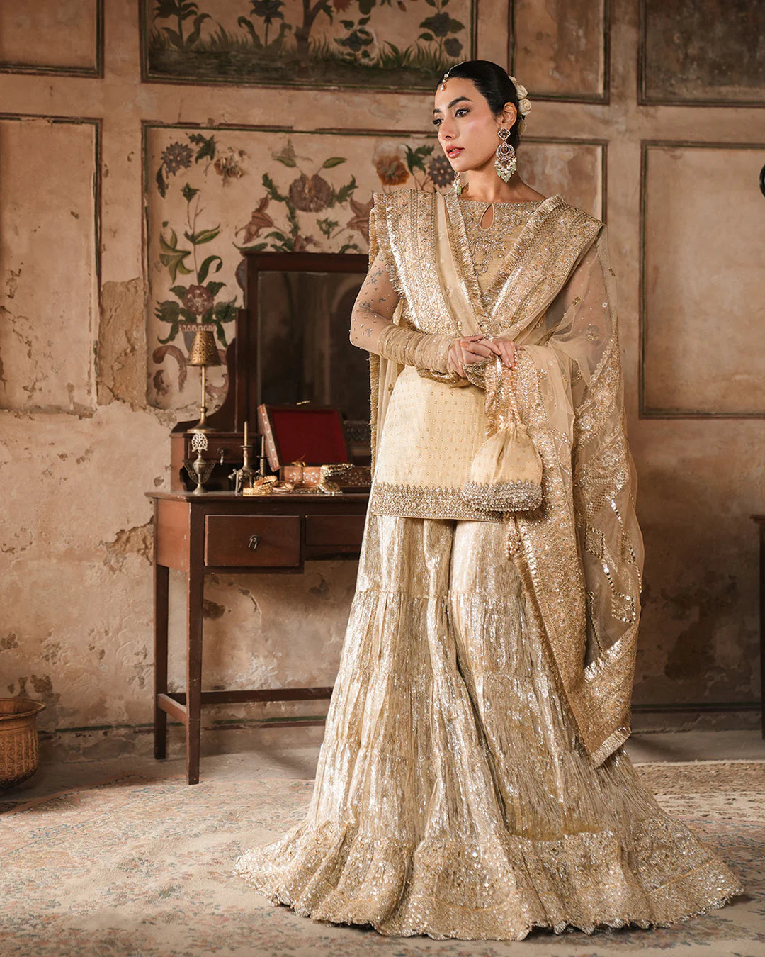 Exuding elegance, Camillie is an extravagant ode to old-world charm. Cut from kundan zari and net sleeves, the gold shirt features an assortment of intricate adornments of pearl, sequins and dabka. Paired with an embroidered net dupatta and an embroidered zari net gharara that lend the ensemble a fluid silhouette, this piece is a total showstopper that you will cherish for years to come.