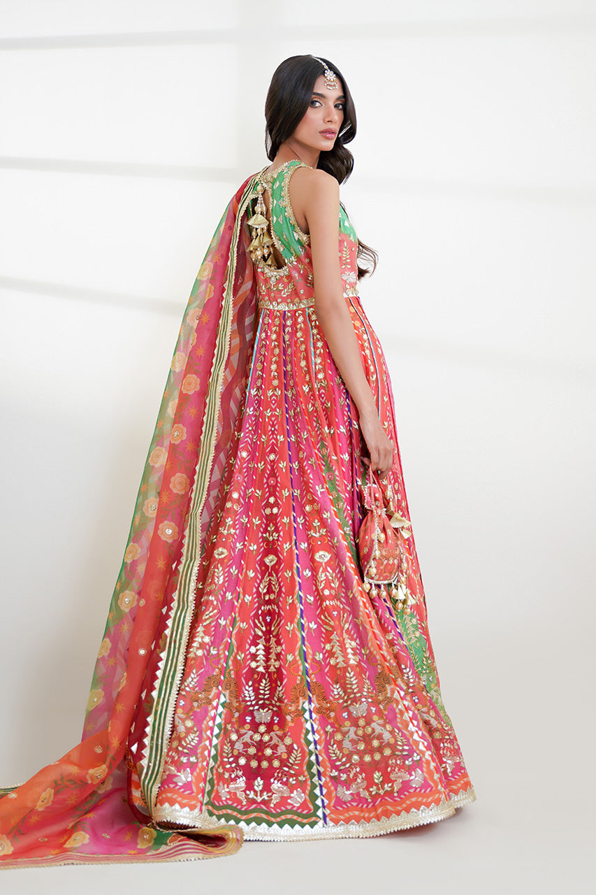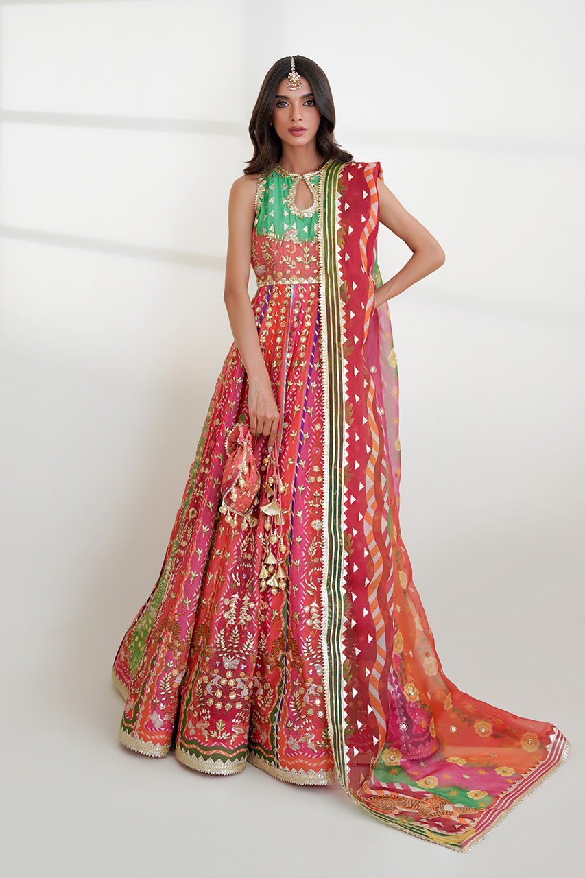 A striking hot pink, tangerine, and turquoise intricately printed cotton net kalidar peshwas is accentuated with meticulously crafted gota and handwork along its slender two toned bodice that transcends into an airy silhouette which glistens with embroidered details. The multicoloured elegant print decorates the flamboyant organza dupatta edged with gota details making it the perfect choice for summer weddings.