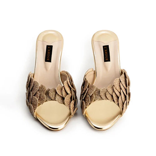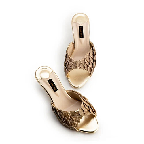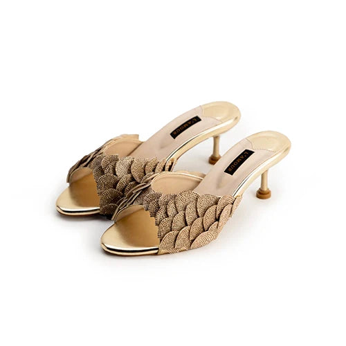 Crafted in a metallic tone, these kitten heels bring a striking blend of refinement and charm. The delicate 'fish scales' design is crowned with a sculpted, crystal-encrusted textured pattern that catches the light beautifully.
