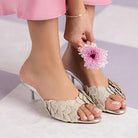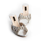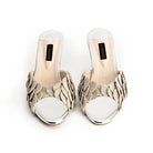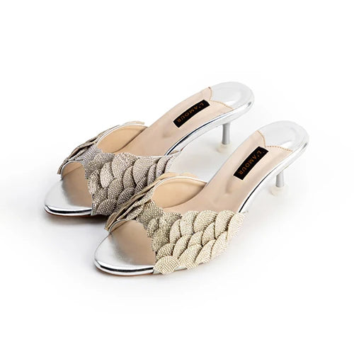 Crafted in a metallic tone, these kitten heels bring a striking blend of refinement and charm. The delicate 'fish scales' design is crowned with a sculpted, crystal-encrusted textured pattern that catches the light beautifully.
