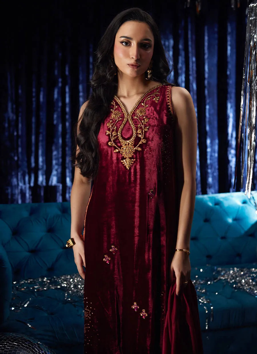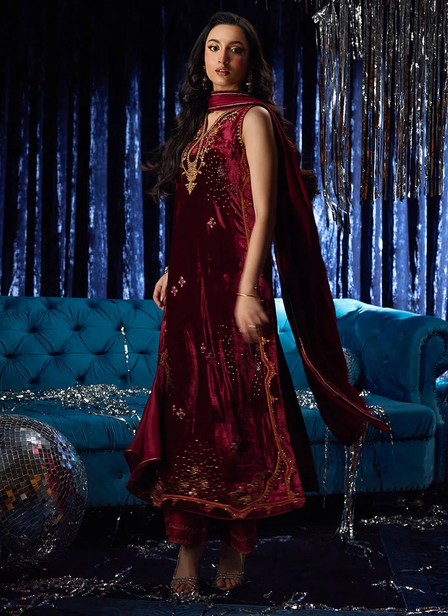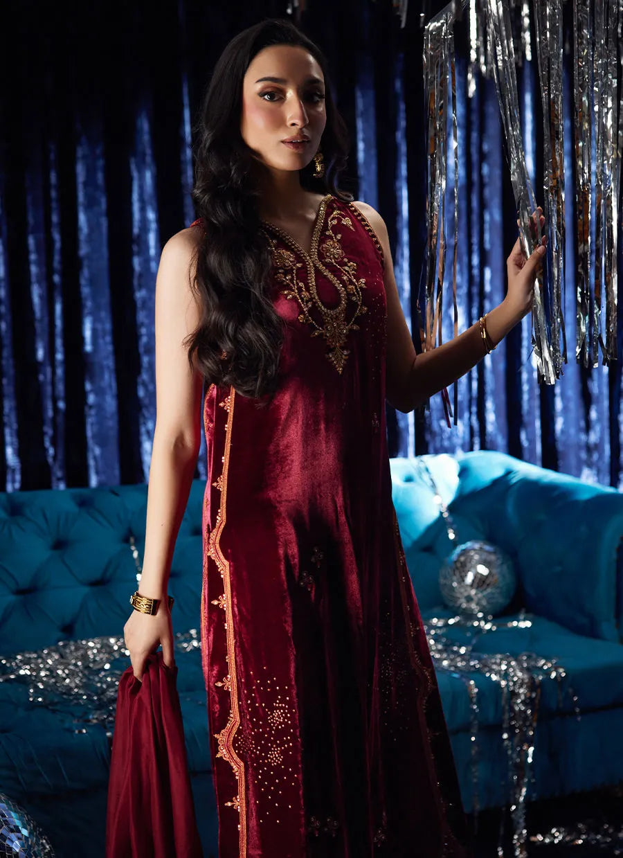 Rich, refined, and effortlessly elegant — this Garnet-red ensemble captures the essence of festive luxury. This straight velvet shirt is exquisitely adorned with zari borders, tilla, nakshi, sequins, pure silk threadwork, and delicate stone work, creating a stunning interplay of texture and shine. The look is elevated with a pure medium silk dupatta finished with gota and velvet trims, paired with a raw silk izaar featuring elegant zari borders. An ensemble that’s timeless yet striking — perfect for evening soirées and celebratory gatherings alike.
