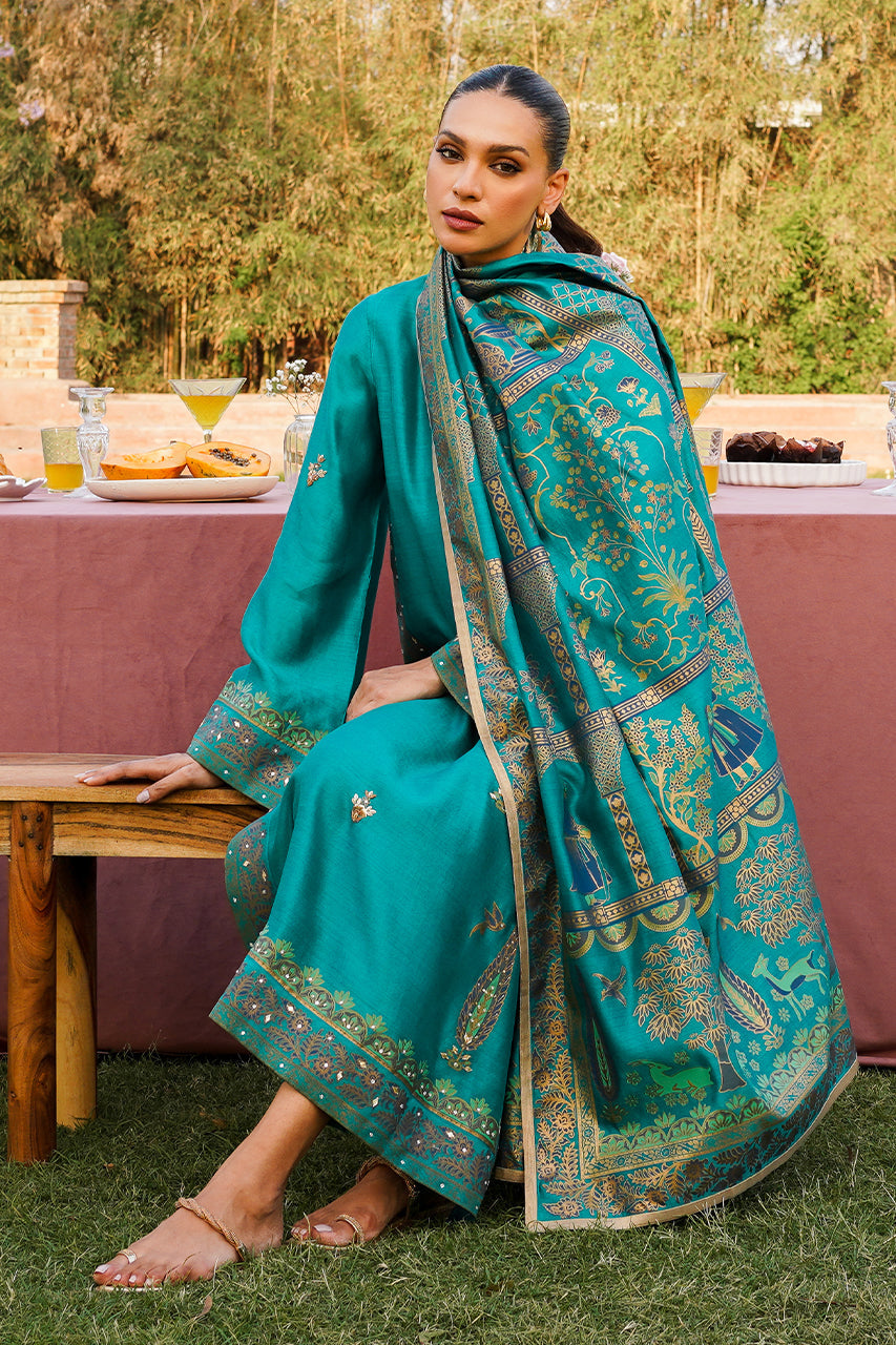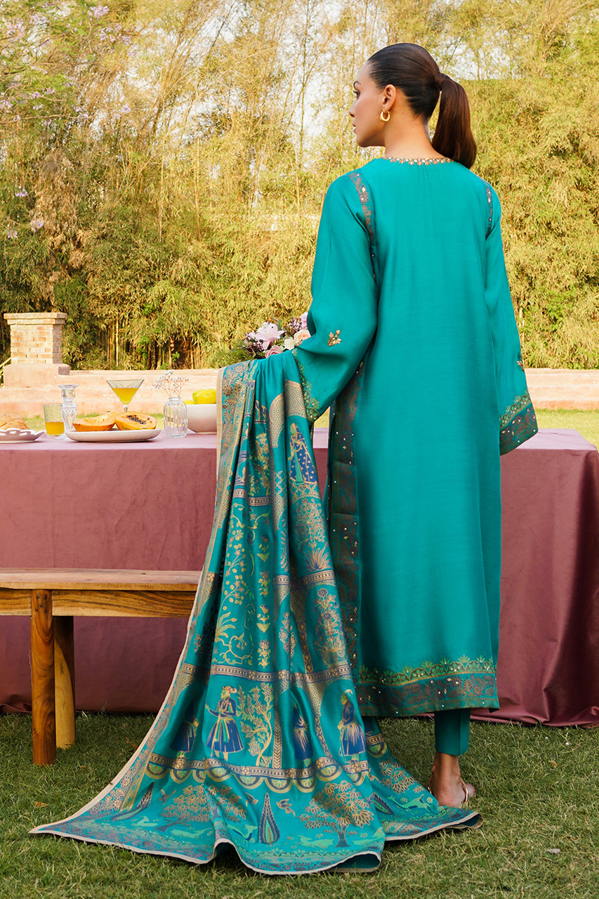 An elegant teal kurta features an intricately zardoze worked neckline with block printed details all over, paired with a matching dupatta. Complete the look with teal rawsilk trousers.