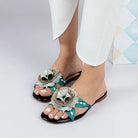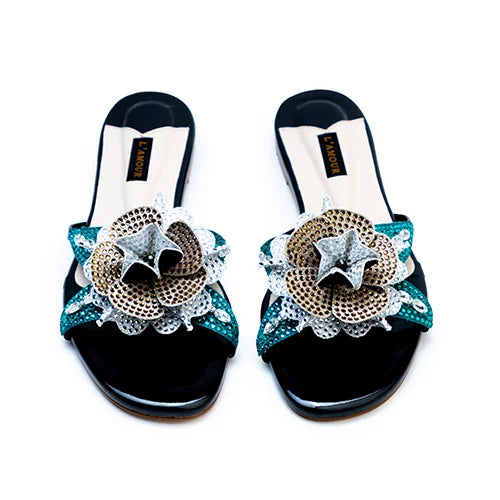 An easy slip on, our BEEBA Flat is made for effortless style - Perfect for dressing up or down, the slip-on silhouette is crafted in iridescent black leather, detailed with a dramatic 3D flower, adorned with multicoloured crystals that add to the glam!