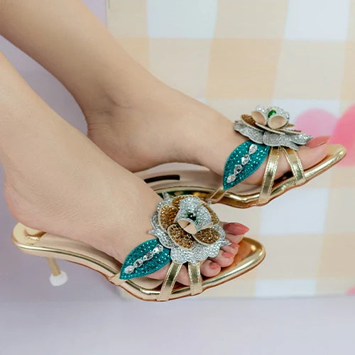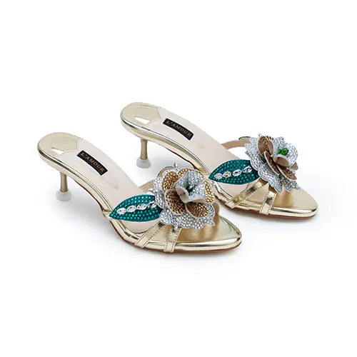 An easy slip on, our BEEBA is now in KITTEN HEELS. Made for effortless style - Perfect for dressing up or down, the slip-on silhouette is crafted in iridescent gold leather, detailed with a dramatic 3D flower, adorned with multicoloured crystals that add to the glam!
