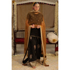 Black bamber silk shirt with badla and tilla embroidery paired with farshi shalwar and a contrasting net mukesh dupatta.