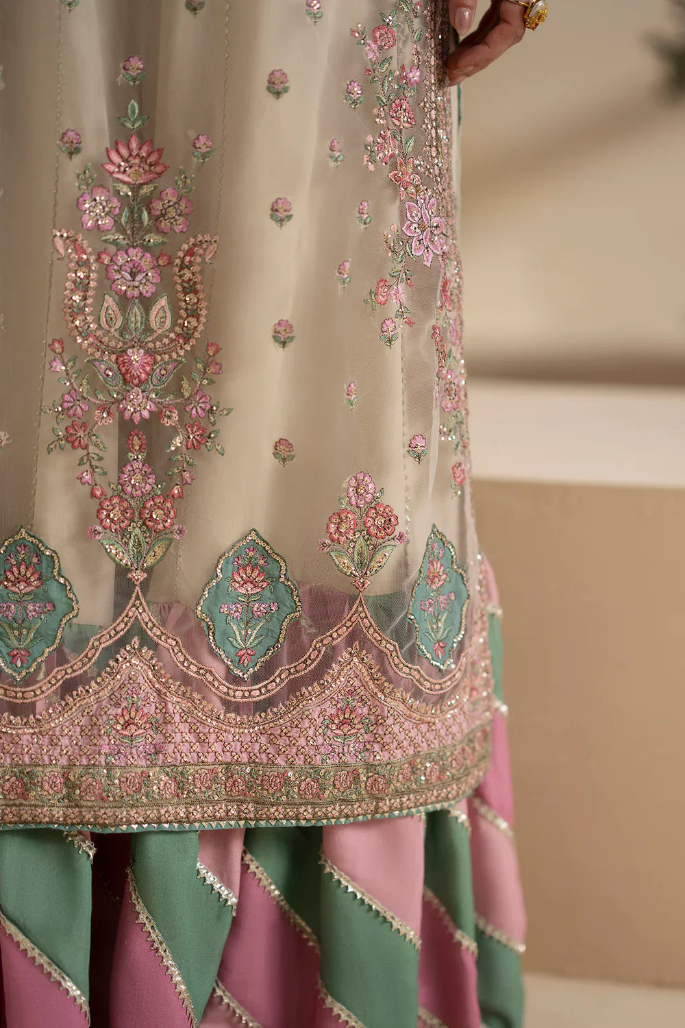 Channel ethereal majesty in this stunning ivory embroidered suit. The ensemble features a long, flowing shirt crafted from sheer net fabric, which is lavishly embellished with intricate pink, gold, and turquoise threadwork and bead detailing across the yoke and full sleeves. The detailed embroidery continues down the length of the shirt in ornate floral and paisley borders. Layered beneath is a slip and a magnificent flared gharara with striking horizontal stripes in complementary shades of pink and green, creating a voluminous and contemporary silhouette. This suit is a regal and unique choice for high-end formal or wedding events.