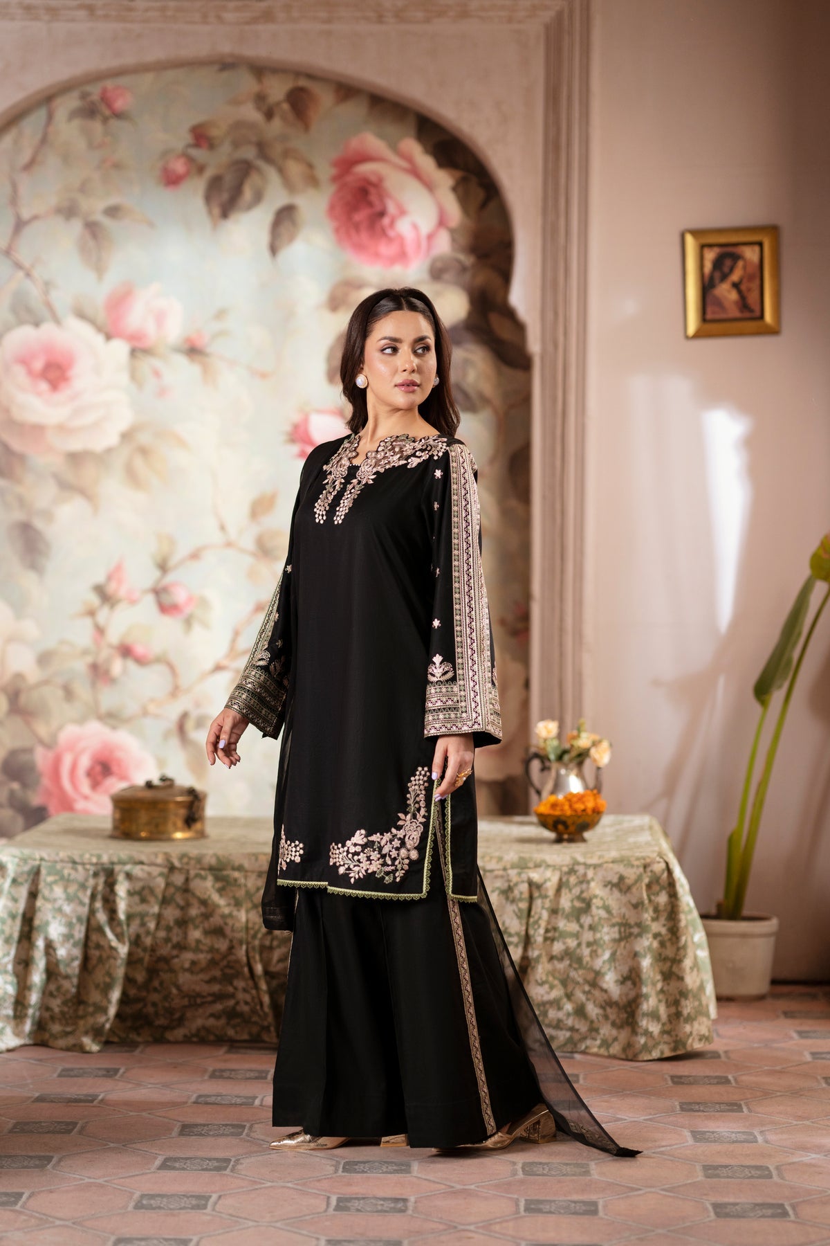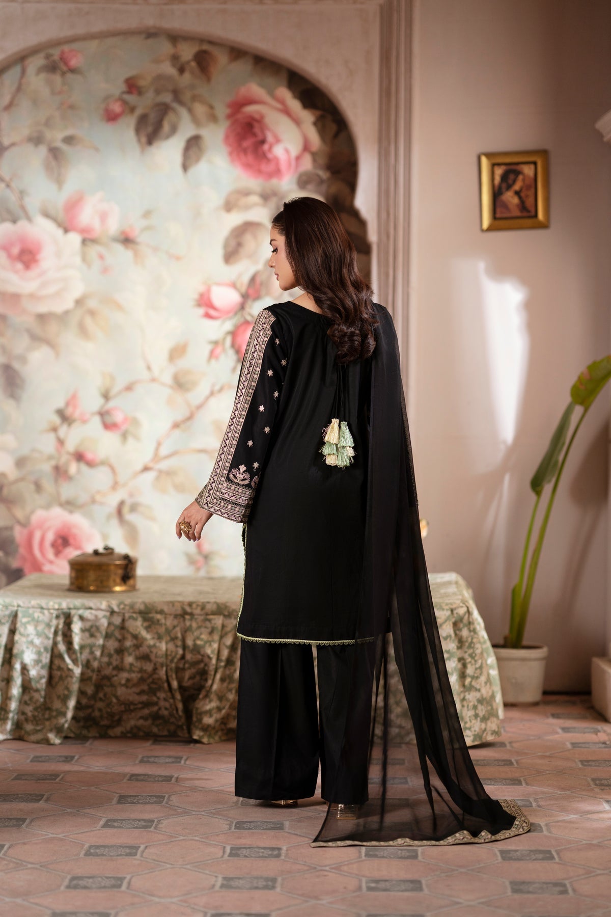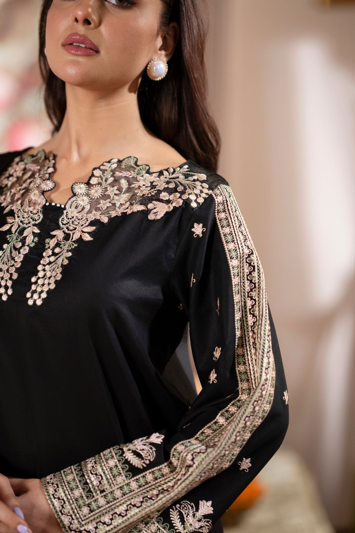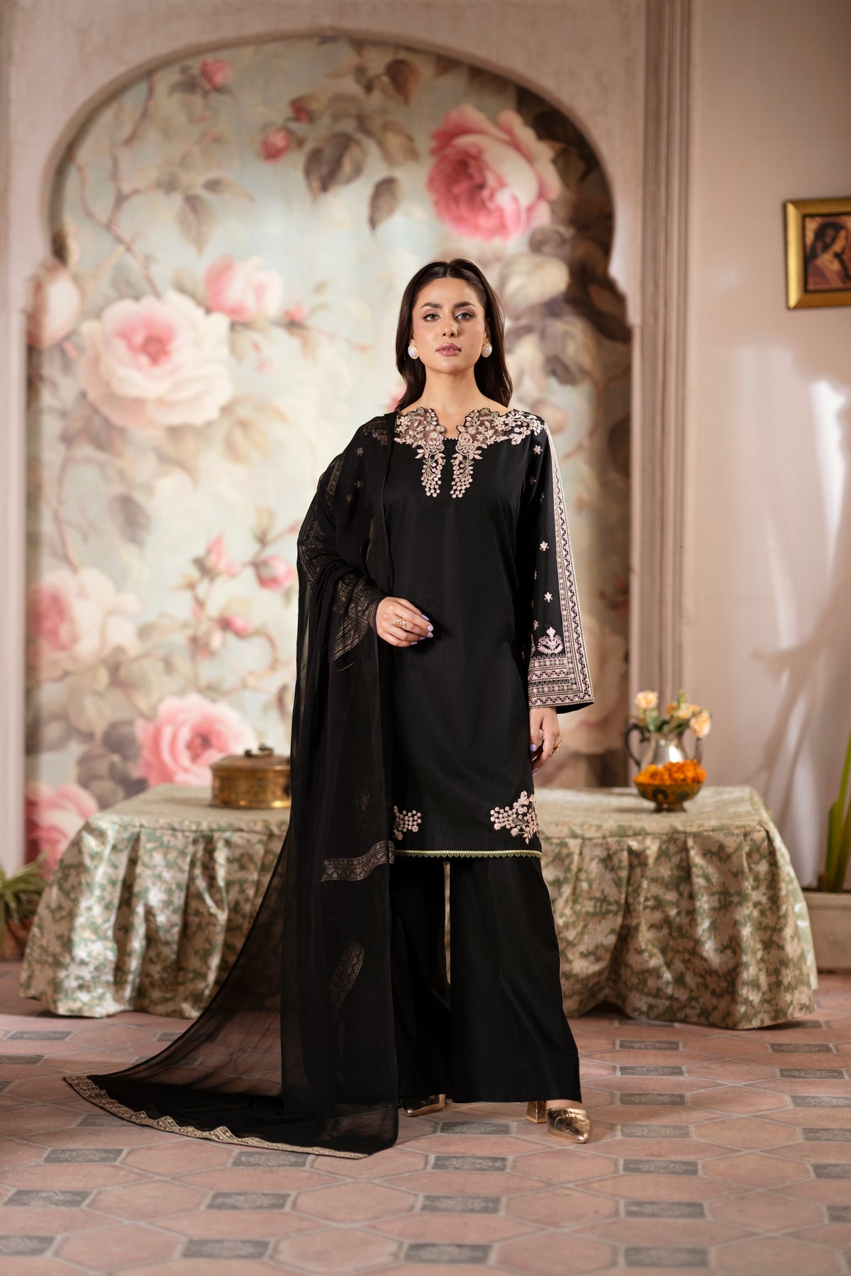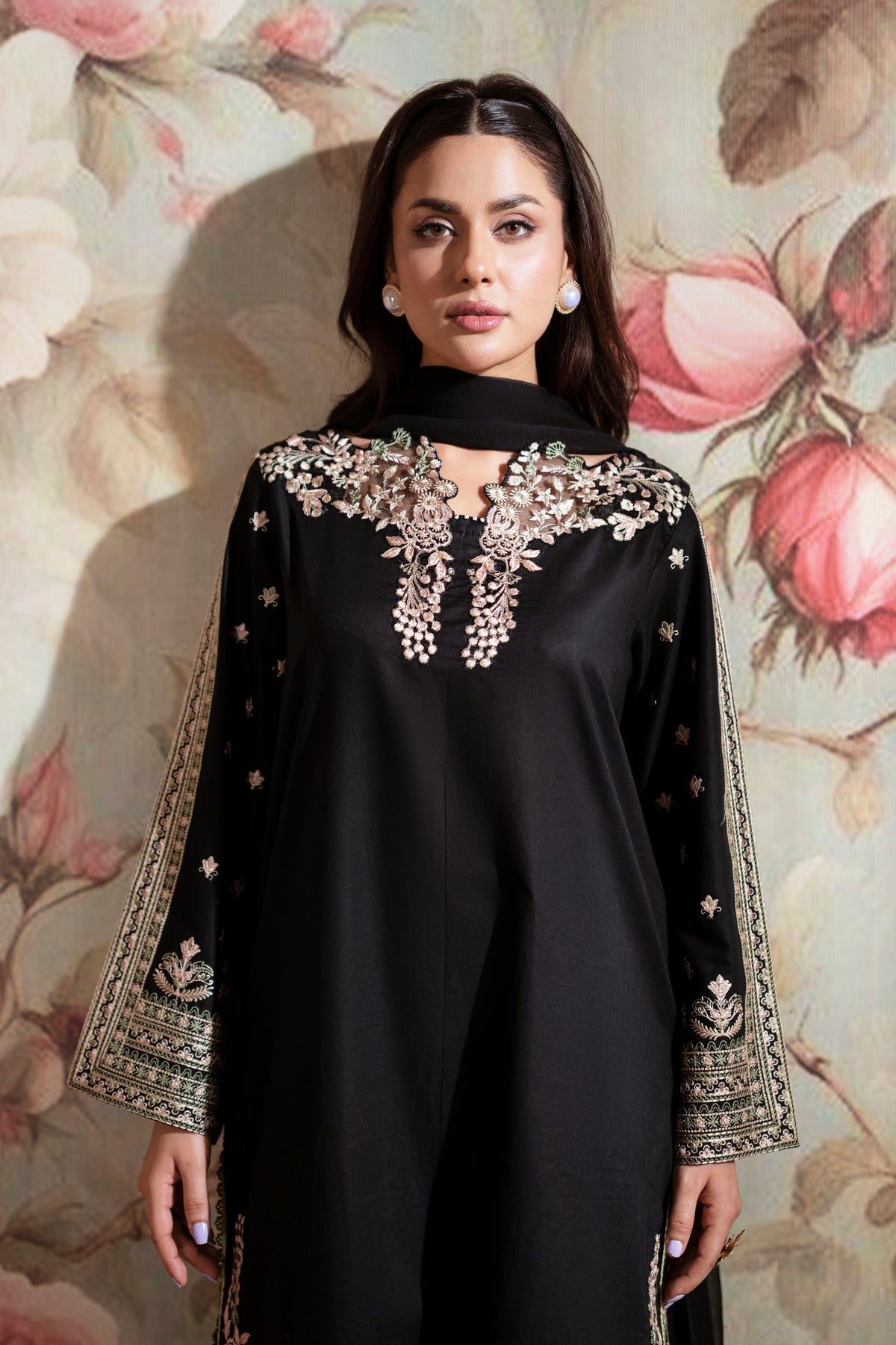 A black Premium quality lawn shirt featuring heavily embroidered sleeves and a delicately crafted tissue-embroidered neckline, finished with lace detailing along the hem. Straight pants adorned with subtle embroidery along the sides. Styled with a complementary chiffon dupatta, elegantly finished with embroidery along the borders.