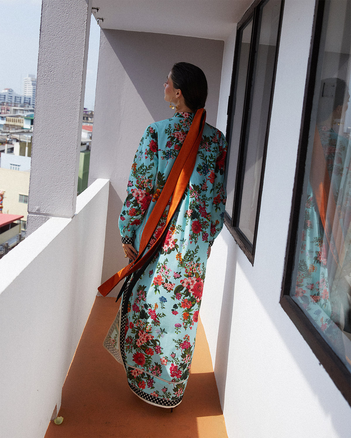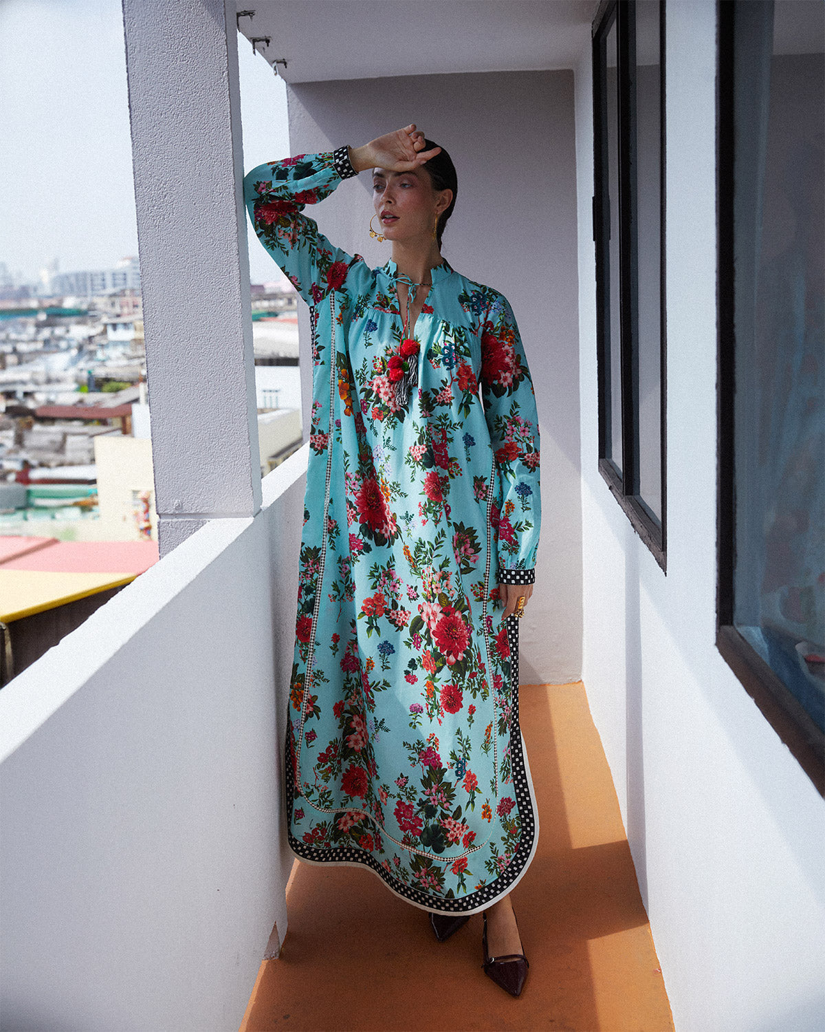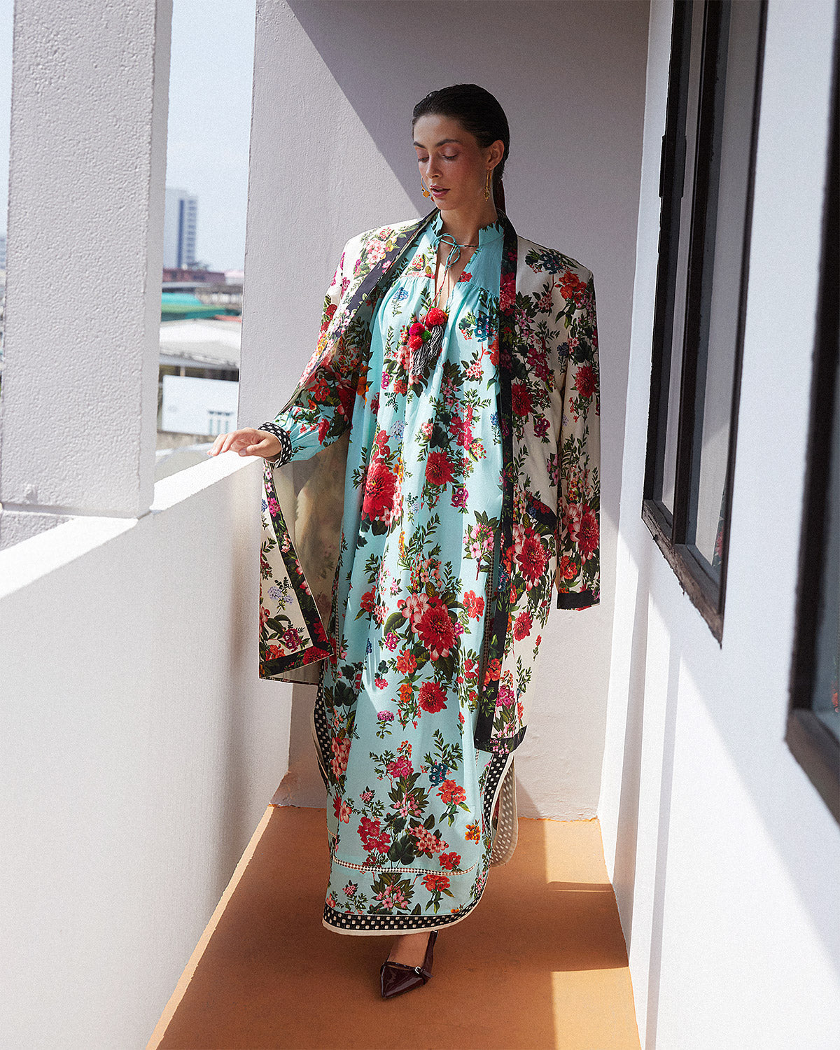 Product Description: Celestial embodies ethereal beauty with its straight long ice blue shirt adorned with delicate floral patterns. The shirt is elegantly finished with embroidered borders and embellished with tassels and insert lace details, adding a touch of whimsy and sophistication to the design. This versatile piece exudes a heavenly charm, perfect for both casual and semi-formal occasions. For a complete ensemble, pair Celestial with the shawl collar jacket that features an ivory base with a colorful floral print and hemming, creating a celestial contrast against the serene ice blue shirt. Together, they create a stunning outfit that is both captivating and stylish, elevating your look with celestial grace.