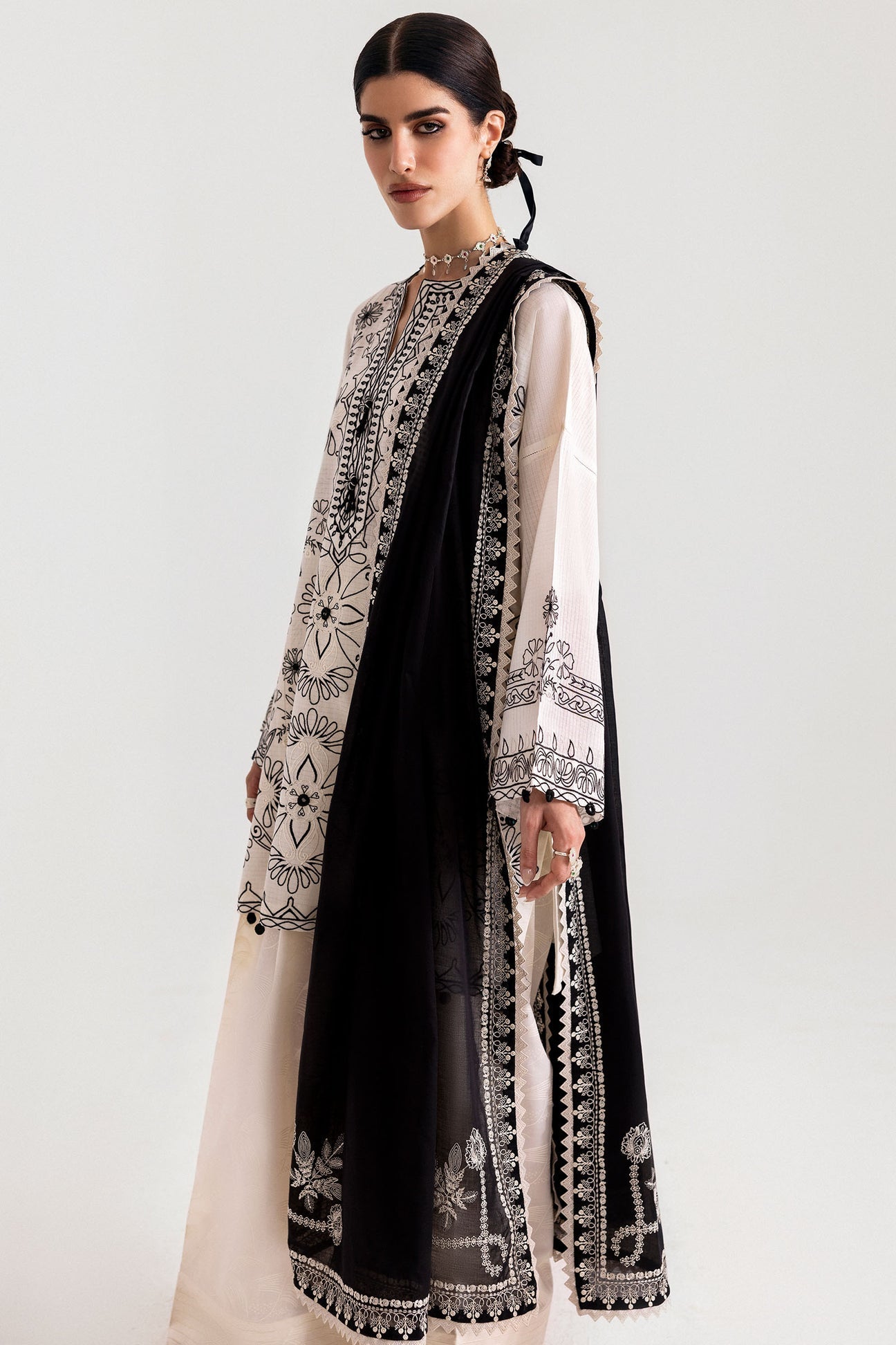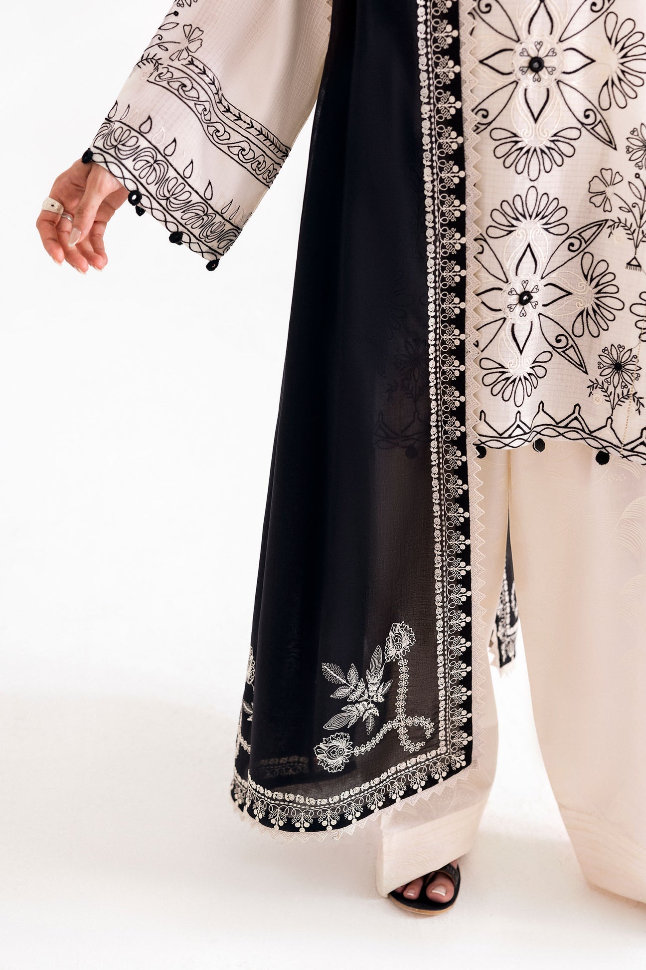 Elevate your look with ZAHA's Noir Botanique Embroidered Dupatta—a timeless statement in monochrome elegance. Crafted from sheer black fabric, this dupatta is adorned with intricate ivory threadwork featuring floral and vine motifs. The borders are framed with delicate lace and a scalloped edge, while miniature accents and bead detailing lend a touch of finesse. A versatile piece designed to pair effortlessly with both traditional and contemporary ensembles.