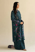 A teal set with a floral scatter, styled with a striped silk dupatta.Digital Printed Silk Dupatta 2.5 MtrsDigital Printed Lawn Shirt 3 MtrsDigital Printed Cambric Trouser 2.3 Mtrs