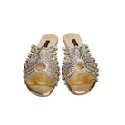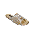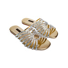 Showcase your enduring sense of style with our cage design 'Christina' kitten flats. Crafted in gold leather, adorned with shimmering micro crystals, this versatile pair features an adjustable strap for a secure fit. Look no further for a statement sandal that promises to make you dazzle.