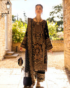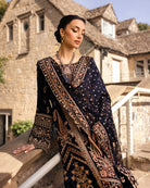 Harmonizing the charm of traditional craftsmanship with the allure of contemporary silhouettes, Divone makes a striking statement. Crafted on navy blue velvet, the shirt and culottes feature dazzling patterns of resham and sequin work. Balancing the richness of velvet is the delicately adorned chiffon dupatta, creating a captivating blend of textures and making this set a versatile choice for the festive season.