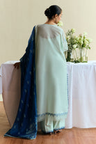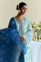 Cool aqua tones meet delicate embroidery, paired with a bold navy cotton silk dupatta—fresh, minimal, and made for easy summer days.