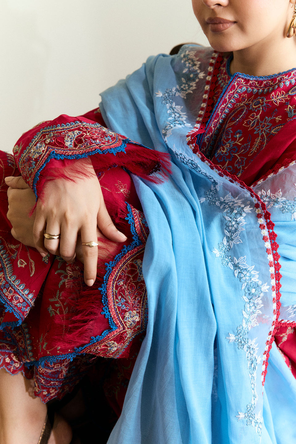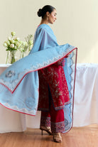A maroon red canvas brought to life with sky blue embroidery and airy organza borders—this unstitched set blends tradition with an easy, everyday charm. Light, effortless, and made for summer days.