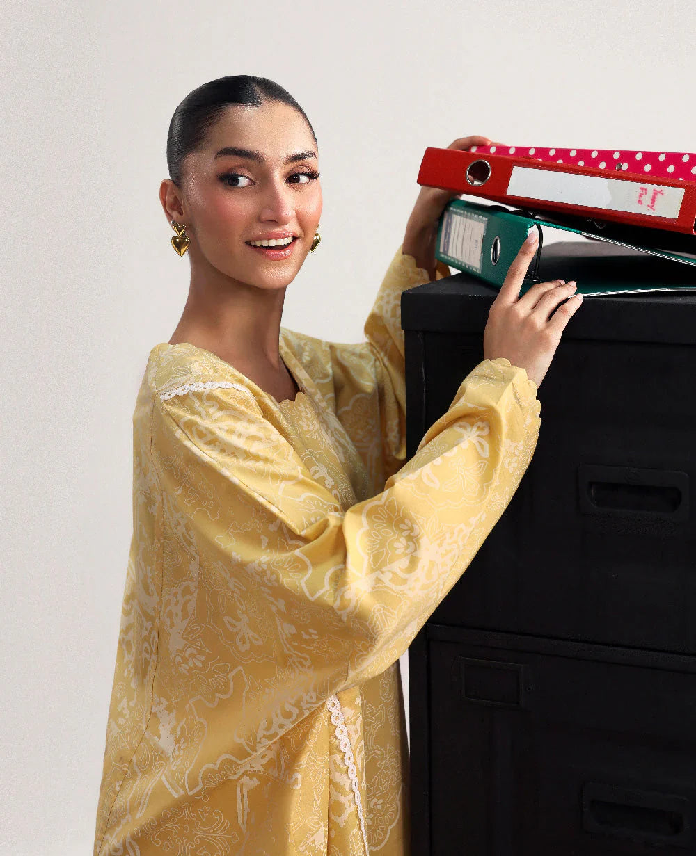 Practical yet cheerful design evokes feminine grace through an intricate repetition of ornate tiles in luminous golden tones, this profound marigold boxy cropped kurta with plain pants yielding a sophisticated synthesis of timeless refinement and modern elegance.