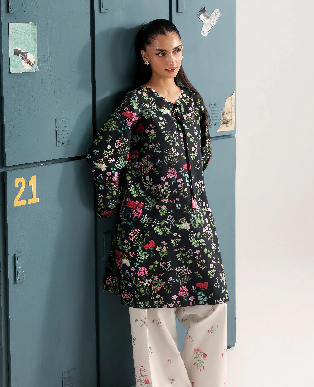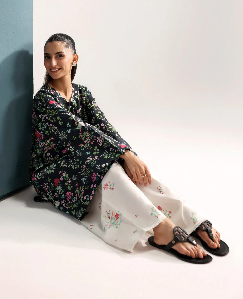 The opulence of black base design highlights radiant bouquets of pink white and green blooms entwined with lush foliage elegantly set against a contrast white lower to create a bold captivating and vibrant aesthetic.