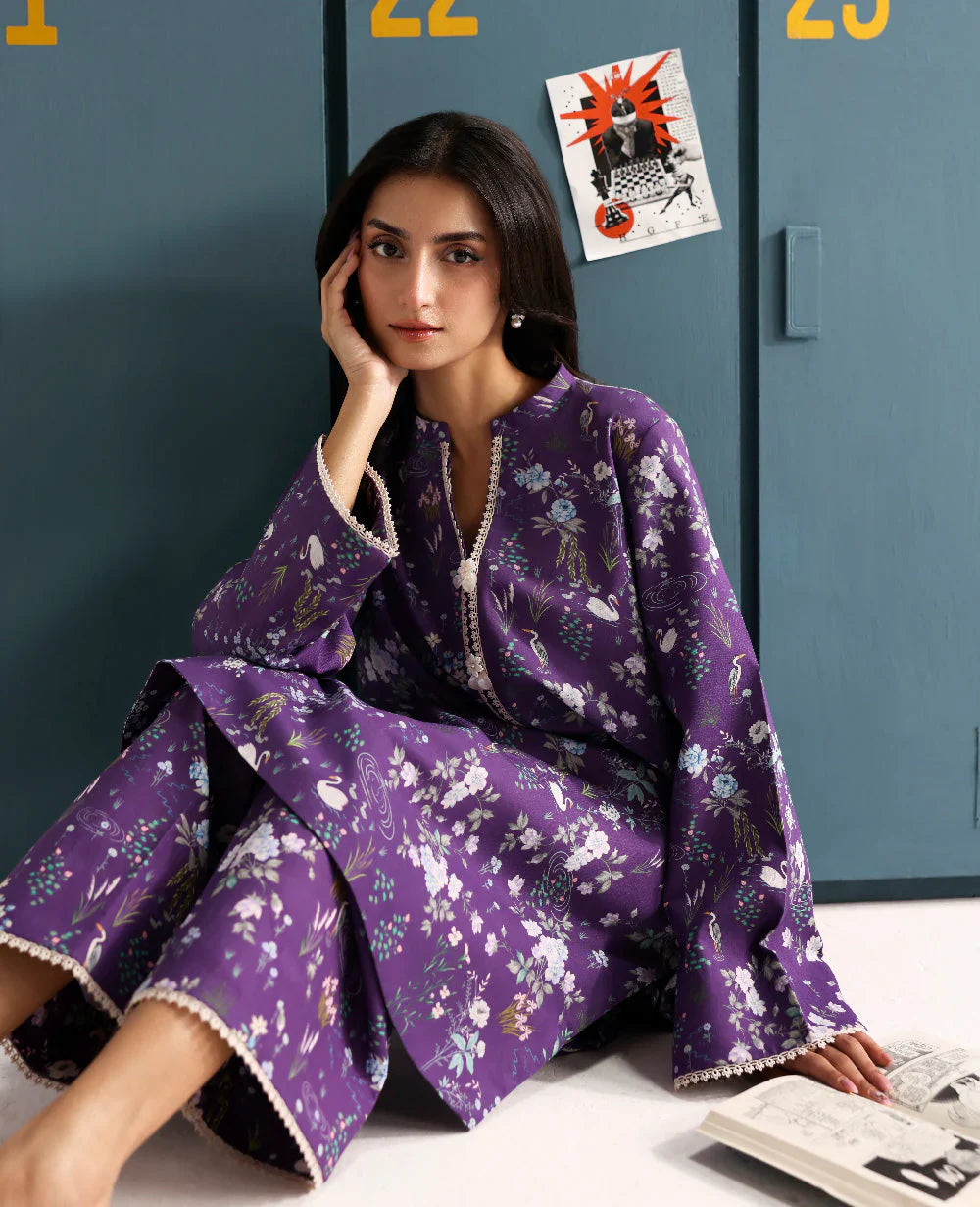 A purple hue cord set print depicts a serene pond and blooming florals in soft tones for an elegant picturesque effect, this laced finished detail Aline shirt with trouser add glamour to your everyday wear.