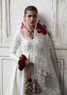 An Ivory Korean raw silk peshwaz, richly embroidered in Gara florals, ornate lappa and gotta detailing at the hem, and luminous silver sequin accents. Paired with a stunning organza dupatta, featuring bold Gara embroidery borders adorned with vibrant red rose motifs, and finished with delicate gotta trimmings. Complemented by a sleek plain Korean raw silk churidar, this ensemble exudes understated elegance.