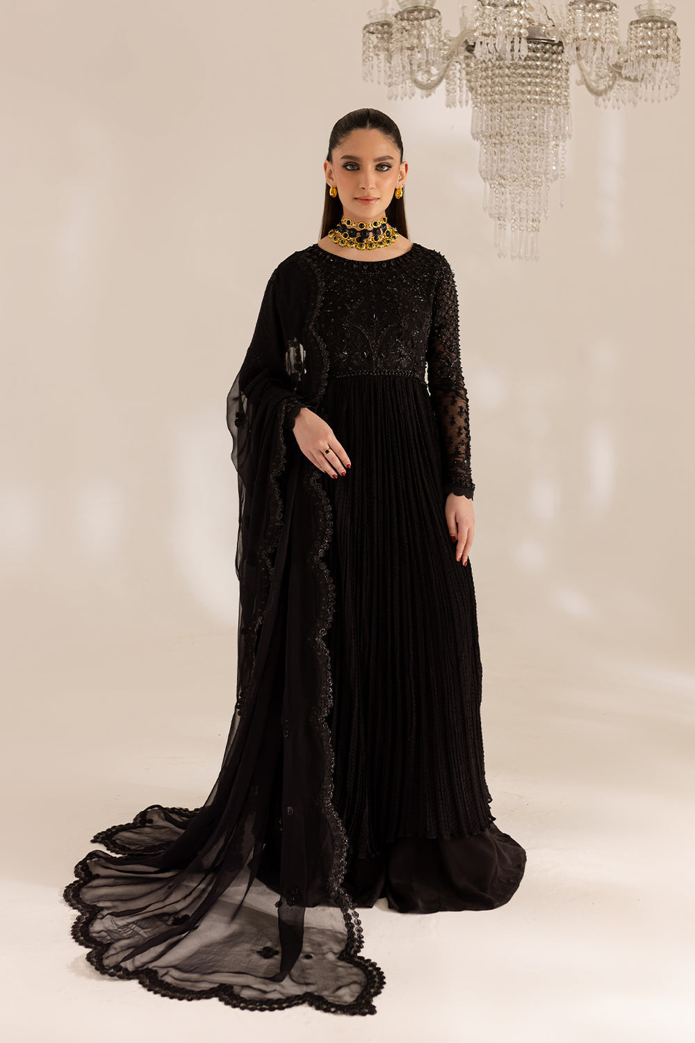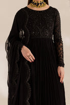 Black chiffon frock enhanced with hand work & embroidery details, paired with trouser & embroidered chiffon dupatta.