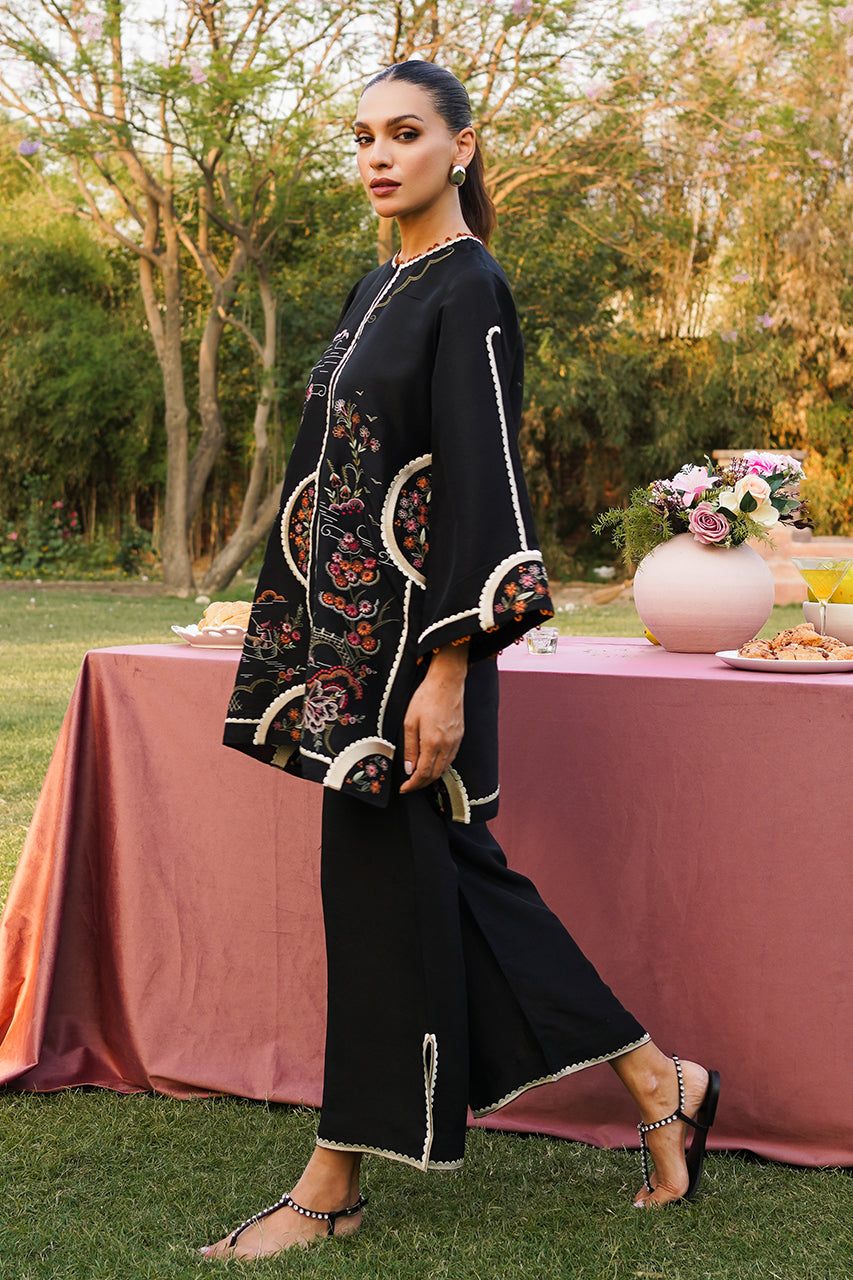 A relaxed silhouette cut from rawsilk, this black top is adorned with floral embroidery all over and paired with matching culottes.