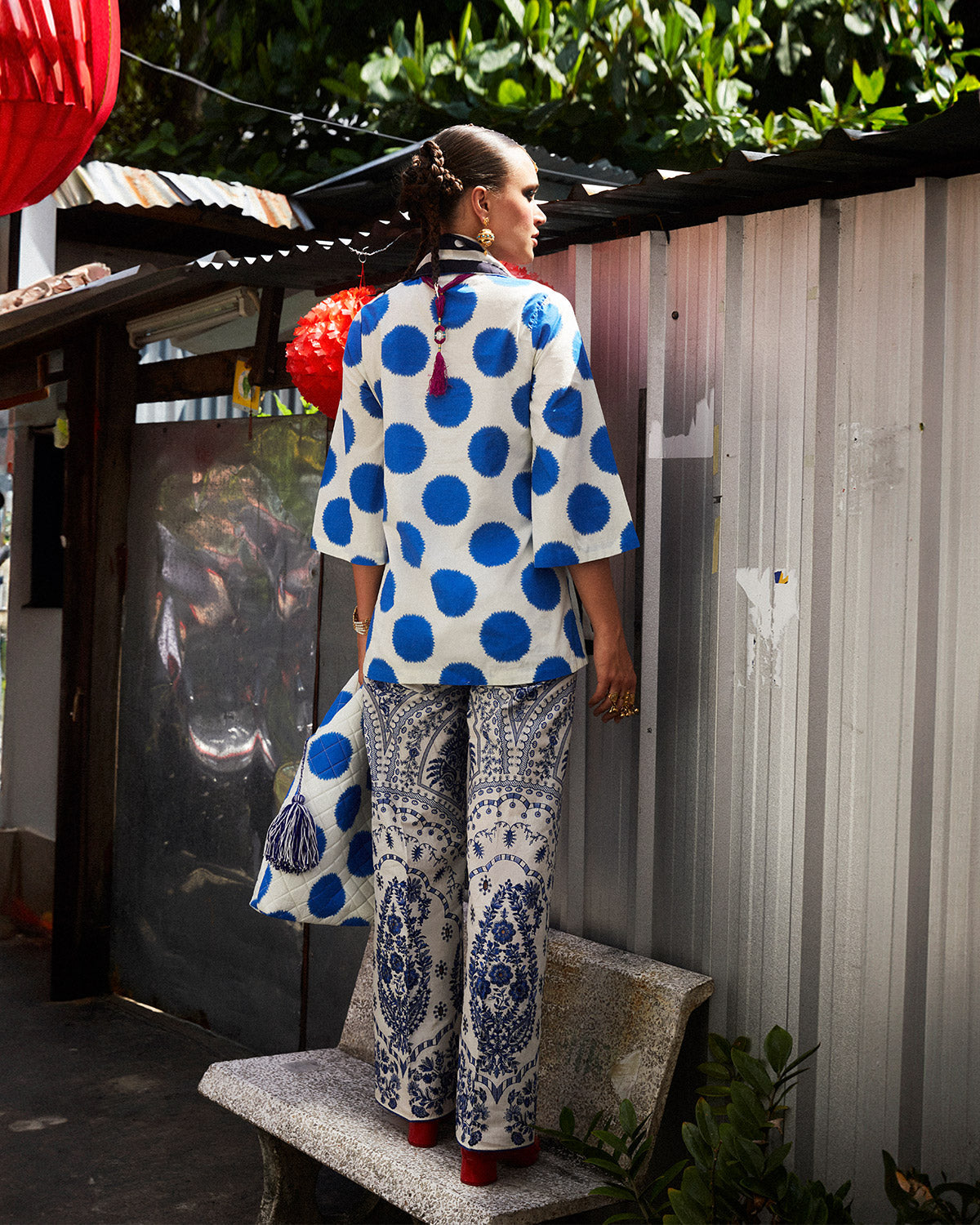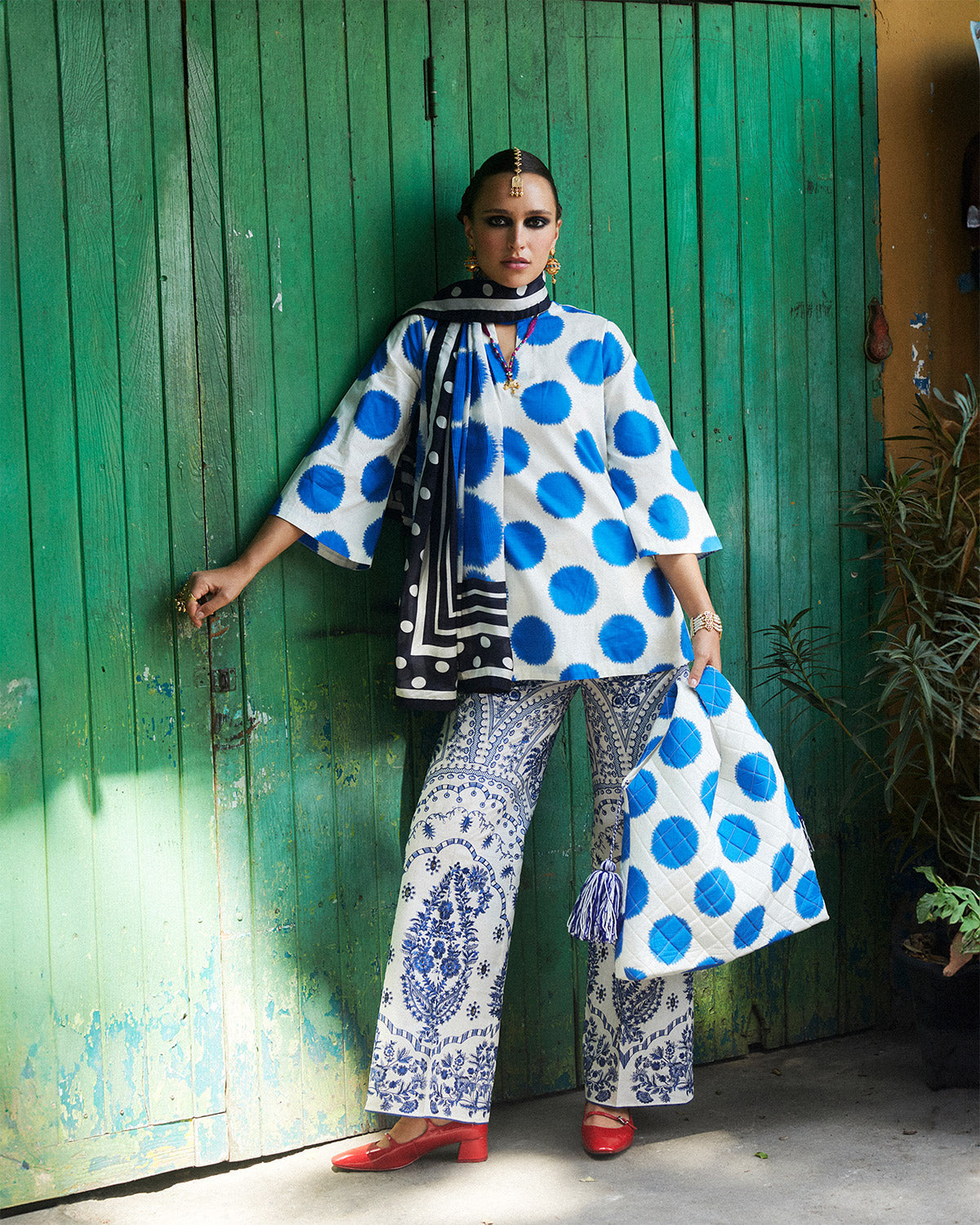 Product Description: An elegant pairing of an ivory cotton shirt and embroidered pants. The shirt features an inky dot print in blue. Paired with matching ivory cotton pants adorned with delicate blue embroidery and printed silk scarf, this ensemble exudes sophistication and style.