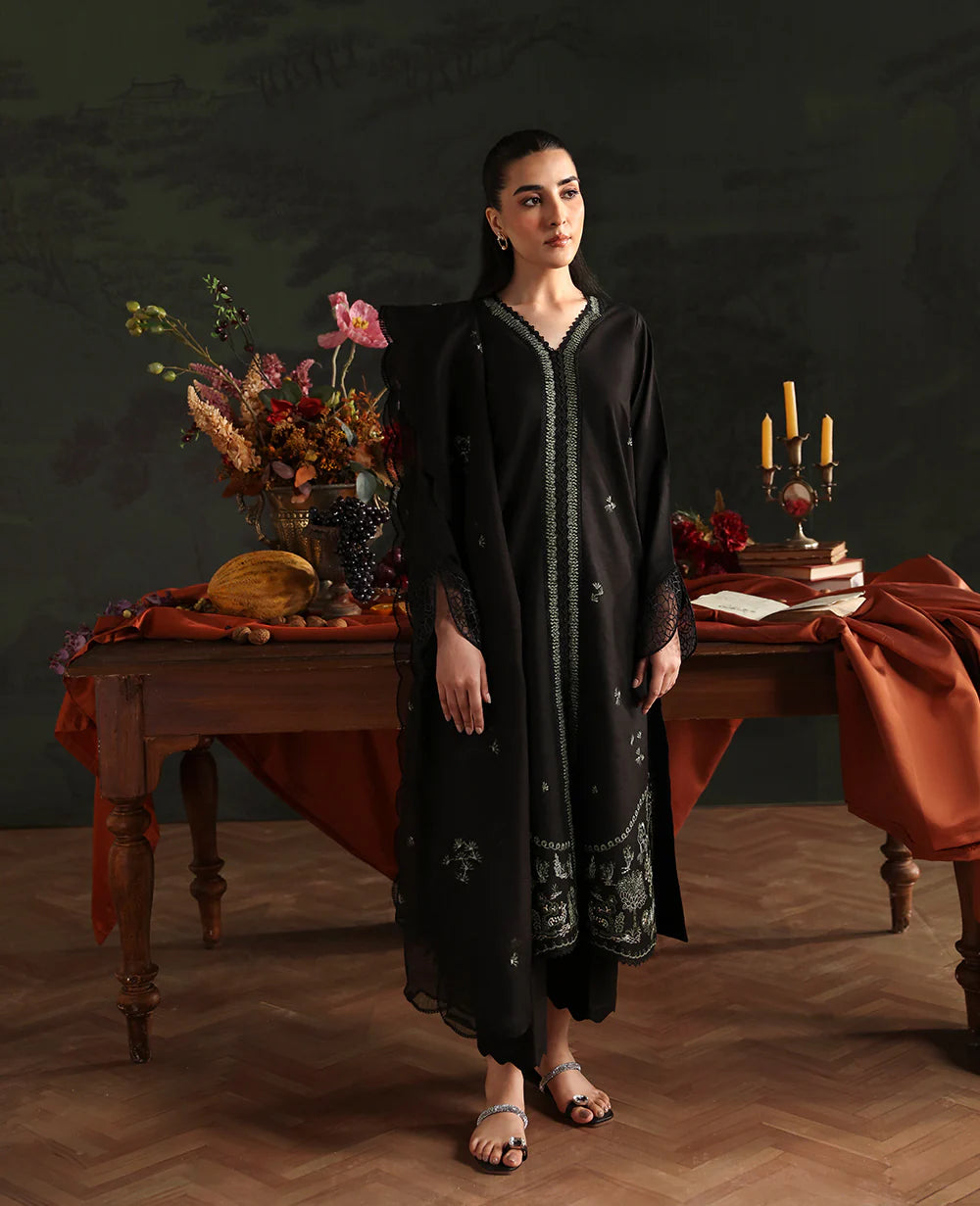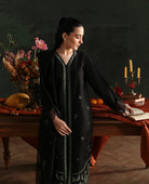 Iris is a chic outfit which showcases a front open shirt in a striking shikargah theme along the hem border, infusing vibrancy into the overall design. The sleeves feature an intricate schiffli pattern, while the dupatta boasts a scalloped edge and delicate spray details, creating a beautiful contrast of textures and colors. Paired with trousers that highlight exquisite scallop stitching, this ensemble is a perfect blend of style and sophistication.