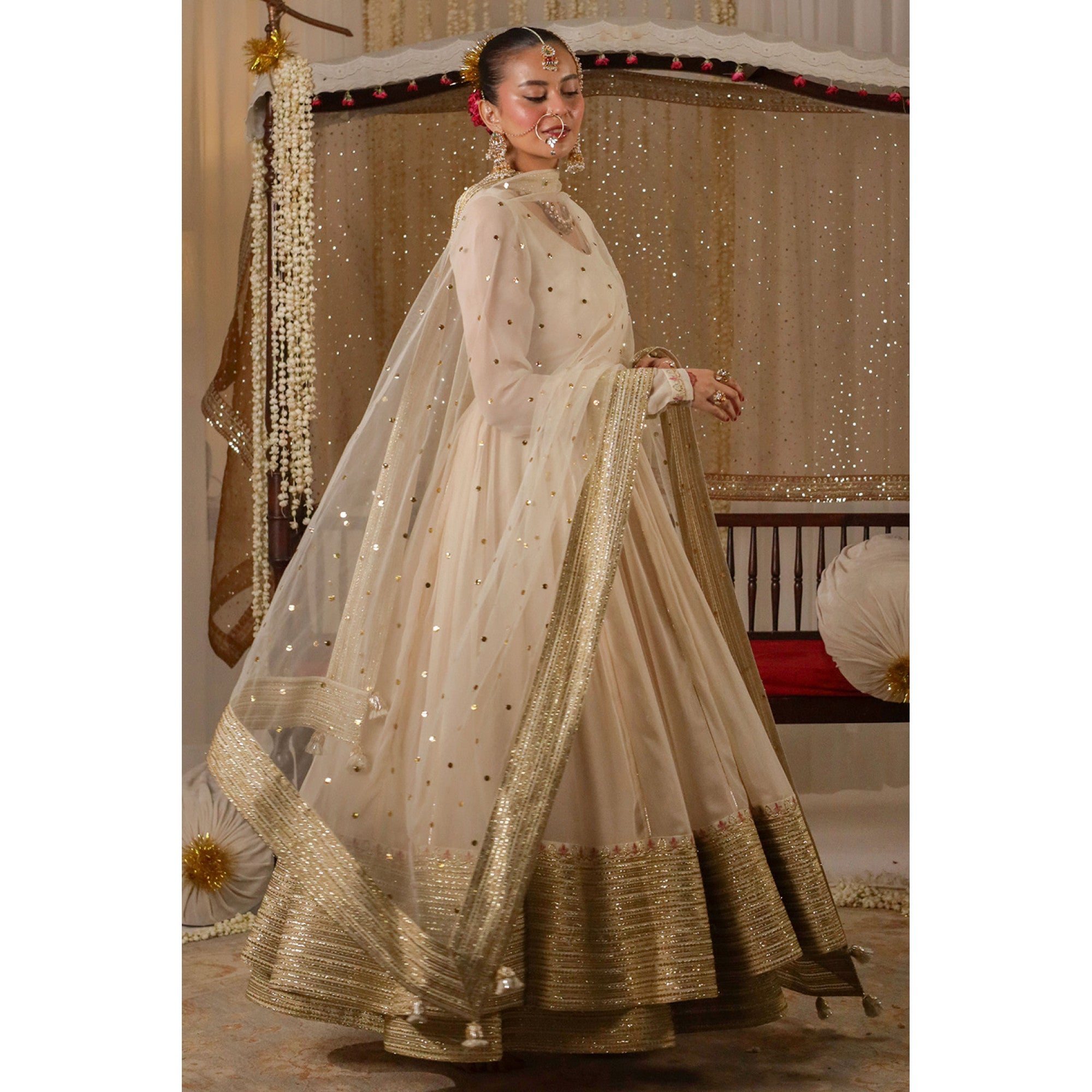 Ivory chiffon anarkali with badla and tilla embroidery and a net mukesh dupatta.