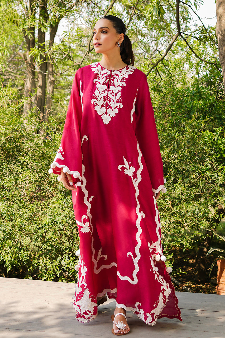 A cherry red kaftan cut from khaddi silk is adorned with floral appliqué all over. The look is complemented with playful pompom details and scalloped edges.