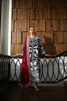 This striking black karandi ensemble is beautifully adorned with white thread embroidery, creating a bold and timeless contrast. The long shirt features intricate floral and geometric motifs spread across the front and sleeves, enhanced with delicate borders for an elegant finish. Paired with a black karandi trouser, the look is elevated with a rich deep red karandi shawl, finely embroidered with dainty motifs and bordered detailing. The combination of monochrome with a vibrant pop of red makes this outfit a true statement piece. Perfect for festive gatherings and evening occasions, it reflects elegance, grace, and refined artistry.