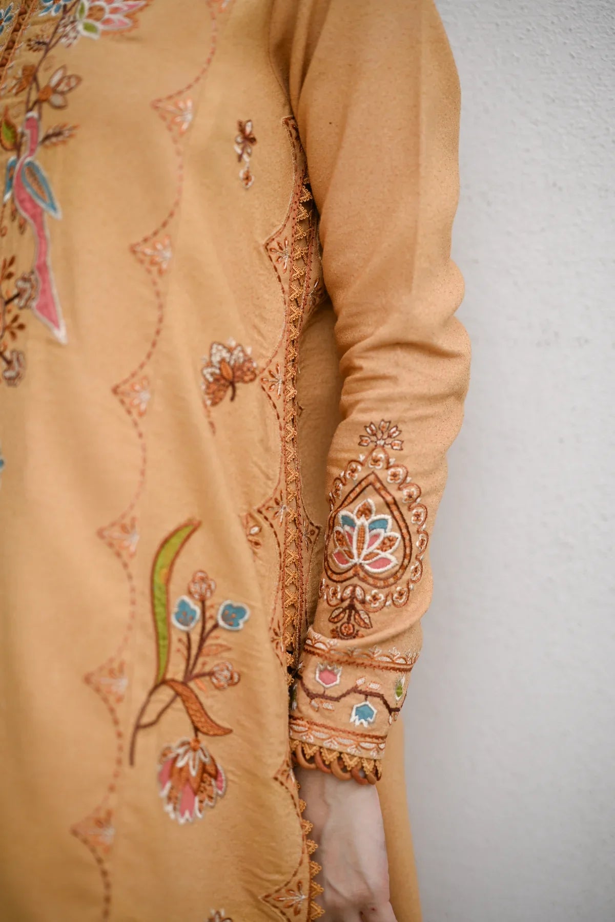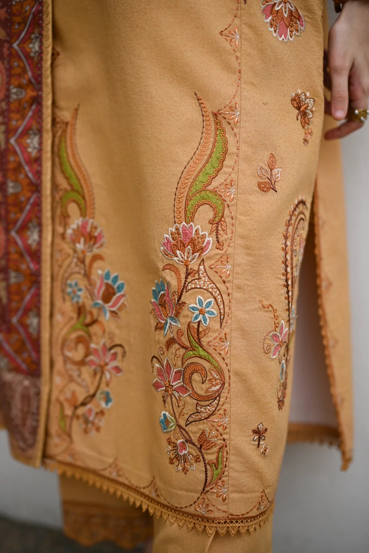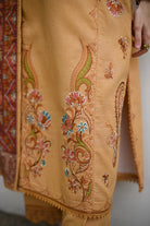 This sophisticated three-piece karandi ensemble centers on a luxurious Mustard Yellowshirt and trousers, embodying a classic warmth ideal for the cooler seasons. The kurta features subtle yet detailed ornamentation, primarily through delicateembroidery or weavingaround the hemline and possibly along the borders, creating a traditional, understated elegance. The true statement piece is the coordinating shawl, which is richly adorned with a complex, elaborateKashmiri or paisley-inspired print/weavein a vibrant palette ofrust, deep maroon, terracotta, and ivory, offering a striking contrast and depth against the solid-colored suit. The overall look is one of refined, timeless tradition, perfect for showcasing cultural heritage at any elevated event.