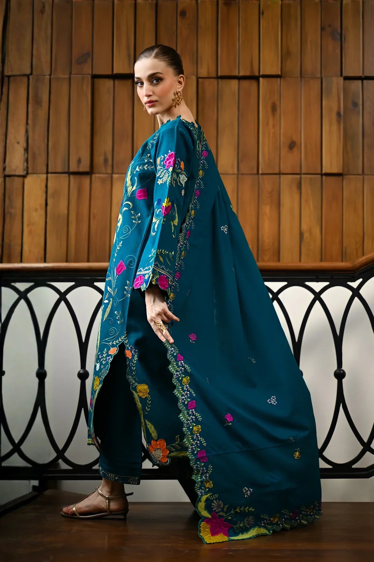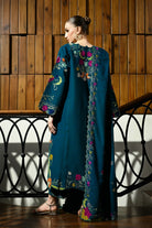 This three-piece article, crafted from luxurious Zinc Karandi, presents a stunning jewel-toned ensemble perfect for the winter season. The deep Teal/Peacock Bluebase fabric is lavishly adorned with vibrant, multicoloredfloral embroiderythat covers the front of the long shirt and extends beautifully onto the matching shawl. This intricate thread-work features shades ofmustard yellow, fuchsia/deep pink, lime green, and royal blue, creating a lush, garden-like motif that is both rich and traditional. The set is completed with coordinating straight trousers, which feature subtle textured detailing or a patterned border near the cuff, ensuring a cohesive and elegantly detailed look ideal for formal occasions.