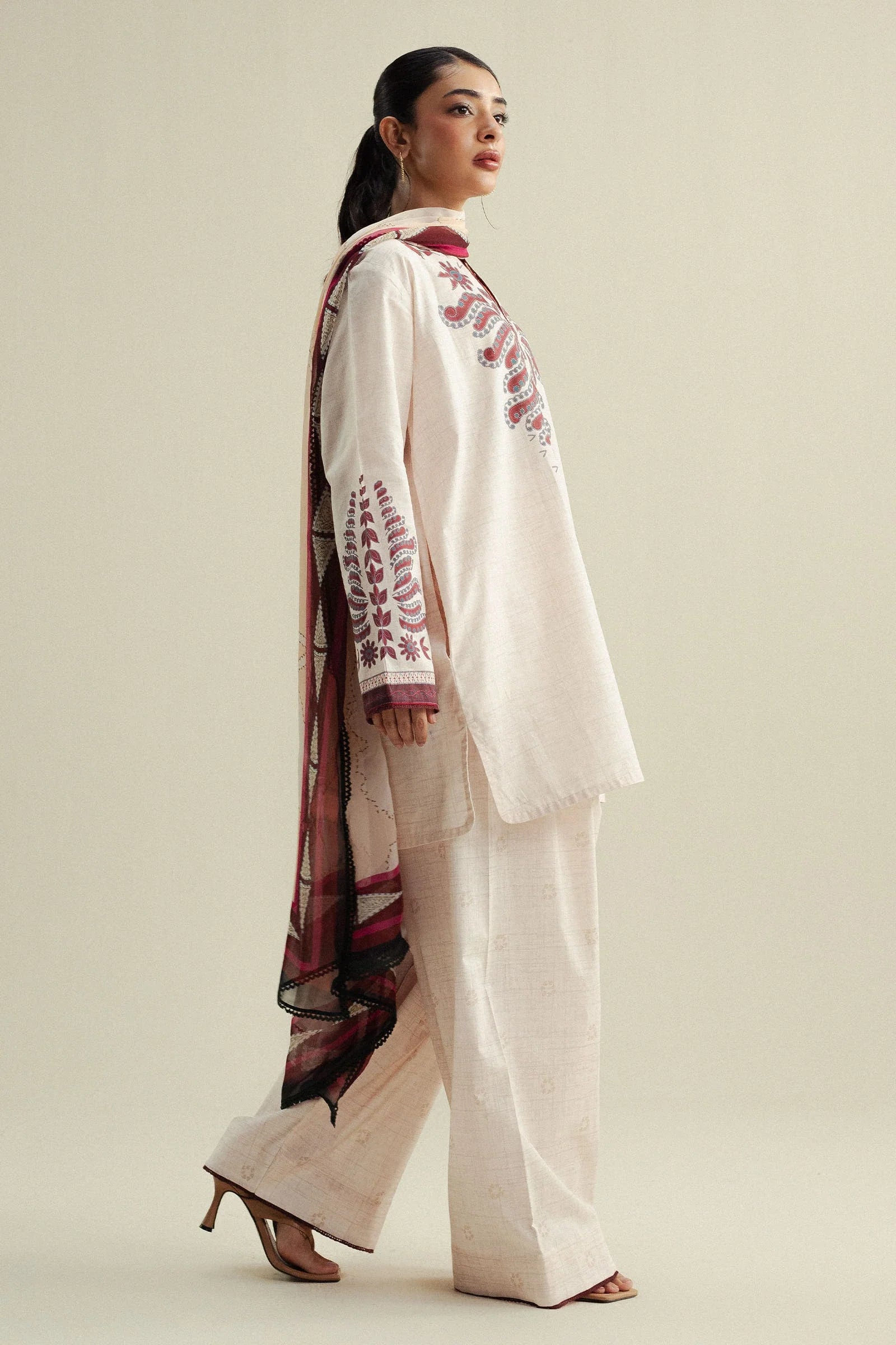 An elegant ivory shirt paired with a printed trouser and finished with a warm biscotti dupatta, bringing subtle charm and refined ease.