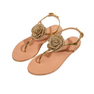 Designed in a soft gold tone, these sandals feature handcrafted floral embellishments that sparkle subtly with every step.