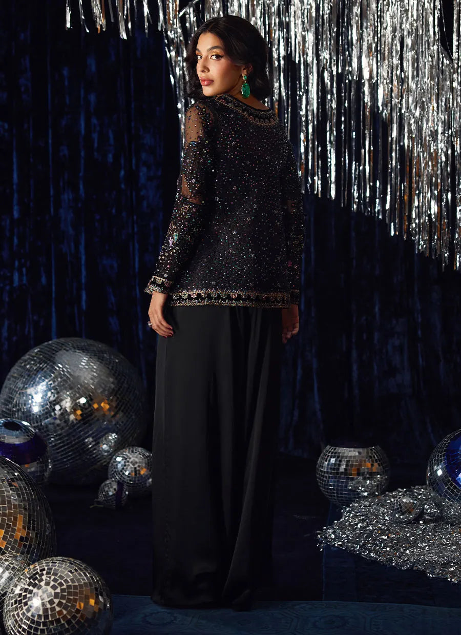 Striking and contemporary, this black organza jacket is a vision of modern elegance. Intricately hand-embellished with colored crystals and naqshi, it exudes a subtle radiance with every movement. The short, front-open silhouette is edged with a plush velvet appliqué, exquisitely adorned with resham and naqshi detailing — a true testament to artisanal craftsmanship. Paired with a sleek raw silk bustier and a fluid black crepe silk skirt, this ensemble seamlessly balances structure and softness, making it the ultimate statement of refined glamour.