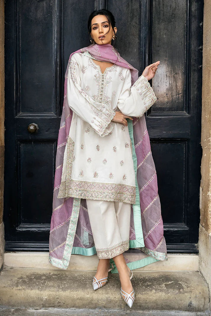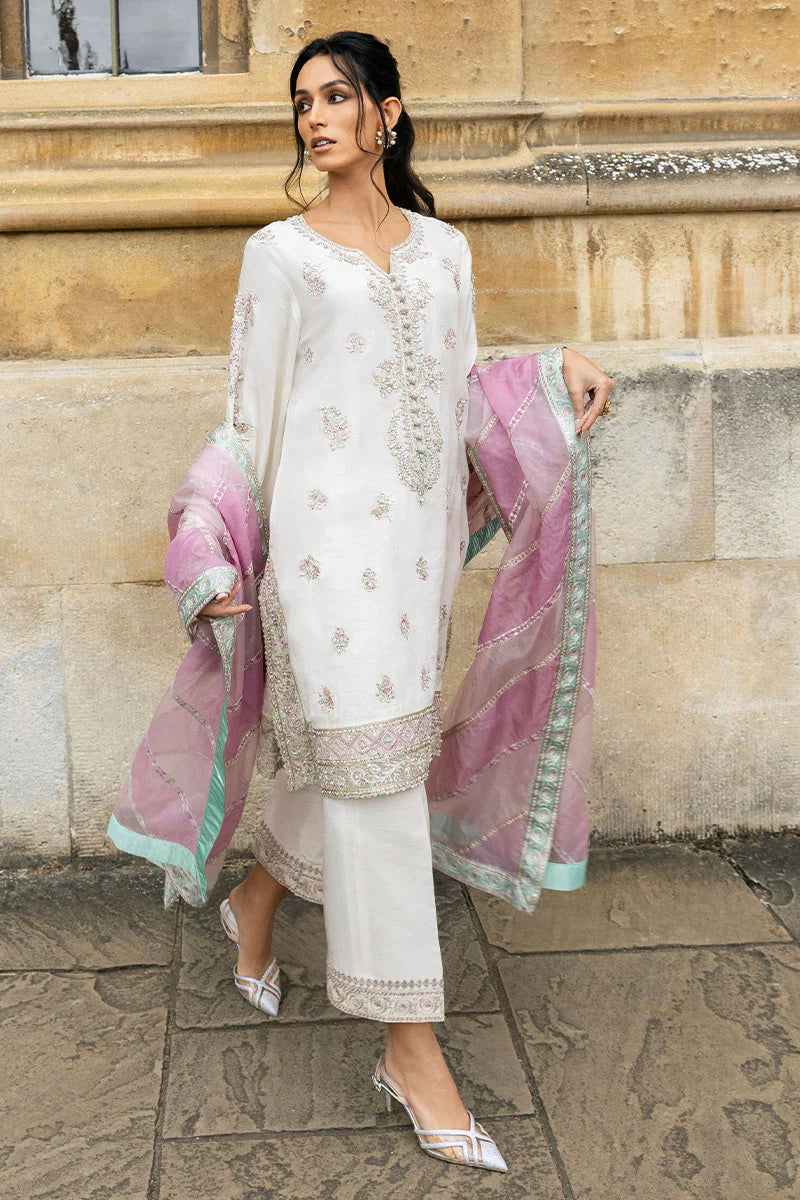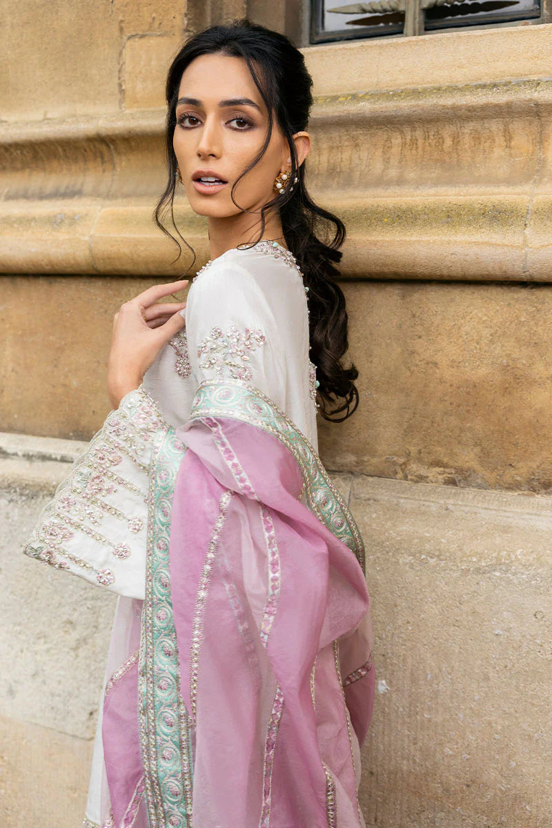 Indulge in elegance with this shirt featuring pure resham embroidery, enhanced with hand-embellished Swarovski crystals, tilla, dabka, and naqshi gemstones. The shirt is finished with laces on the daman and hem, while the pants are adorned with organza embroidered and hand-embellished borders. The ensemble is completed with a dupatta showcasing a diagonal color-blocked design, sequins detailing, and a four-sided silk embroidered border for a touch of sophistication.
