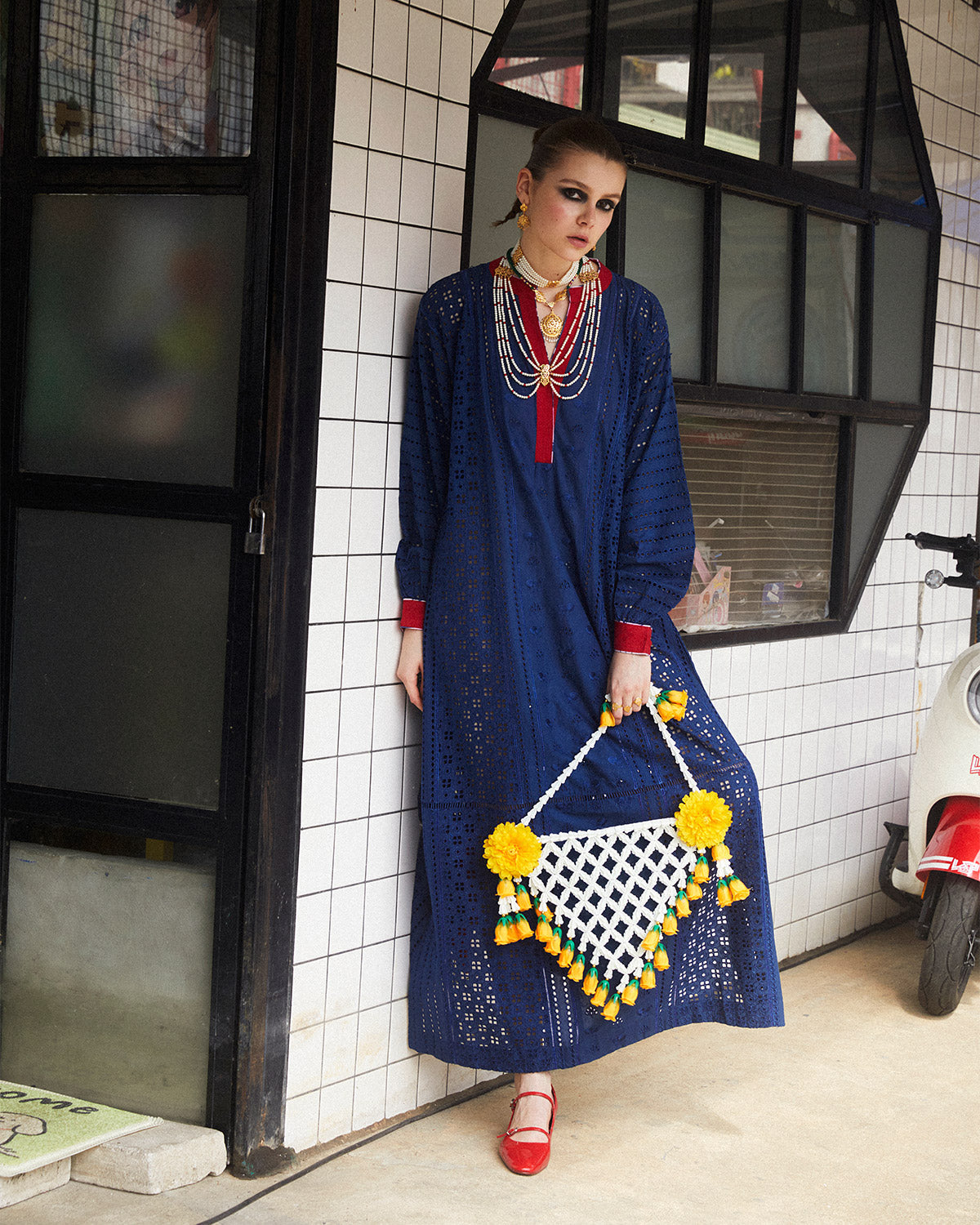Product Description: This stunning outfit features a long straight shirt with intricate shiffli embroidery, exuding timeless elegance. The slide slits and red details on the sleeves and neckline add a touch of vibrancy and allure, while the matching trousers complete the ensemble with effortless style.