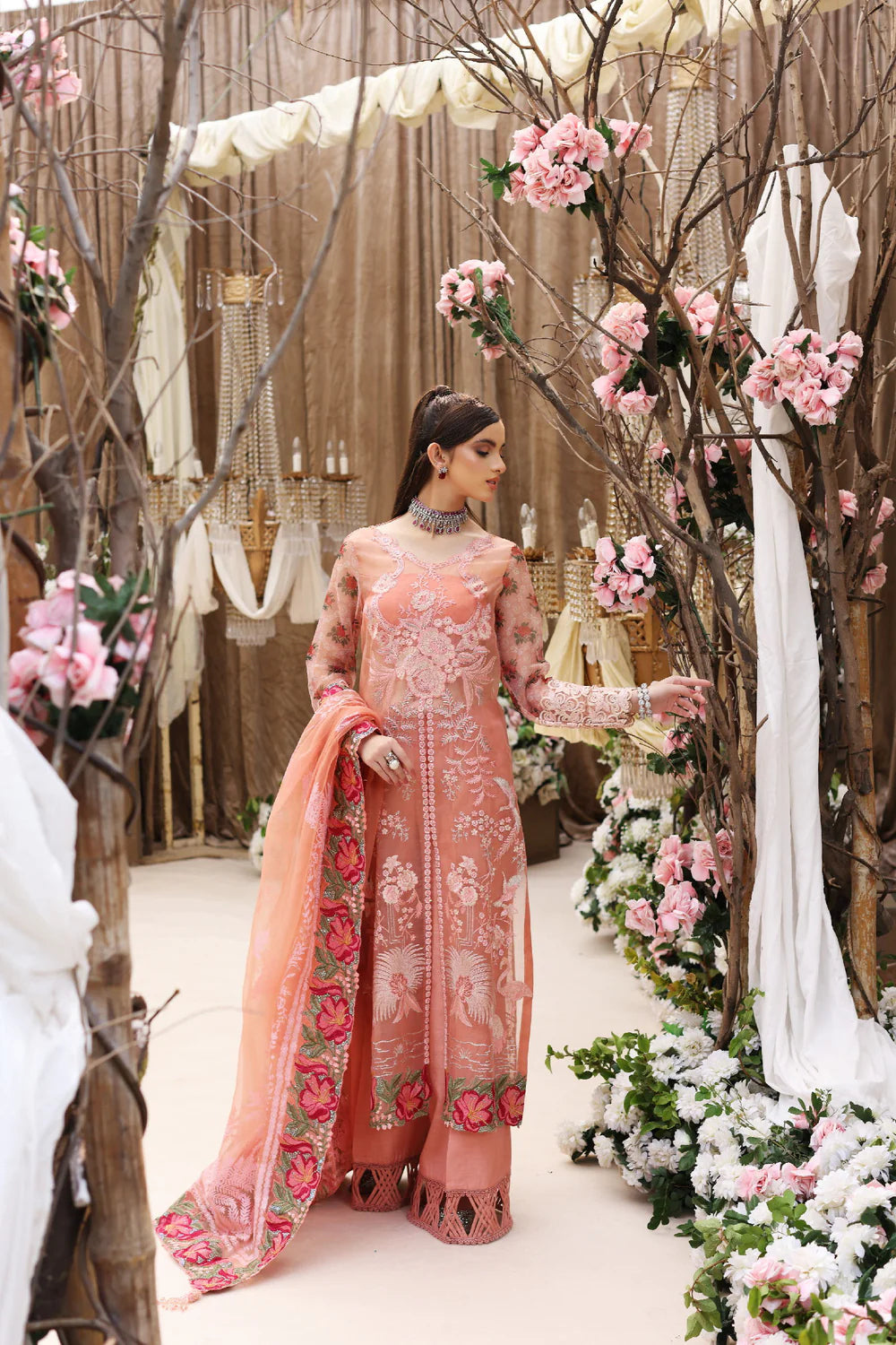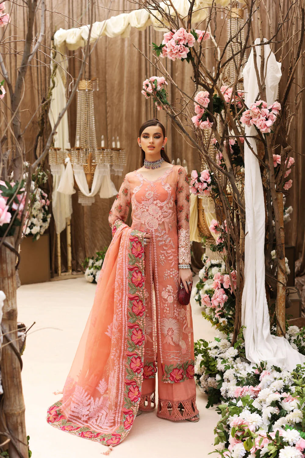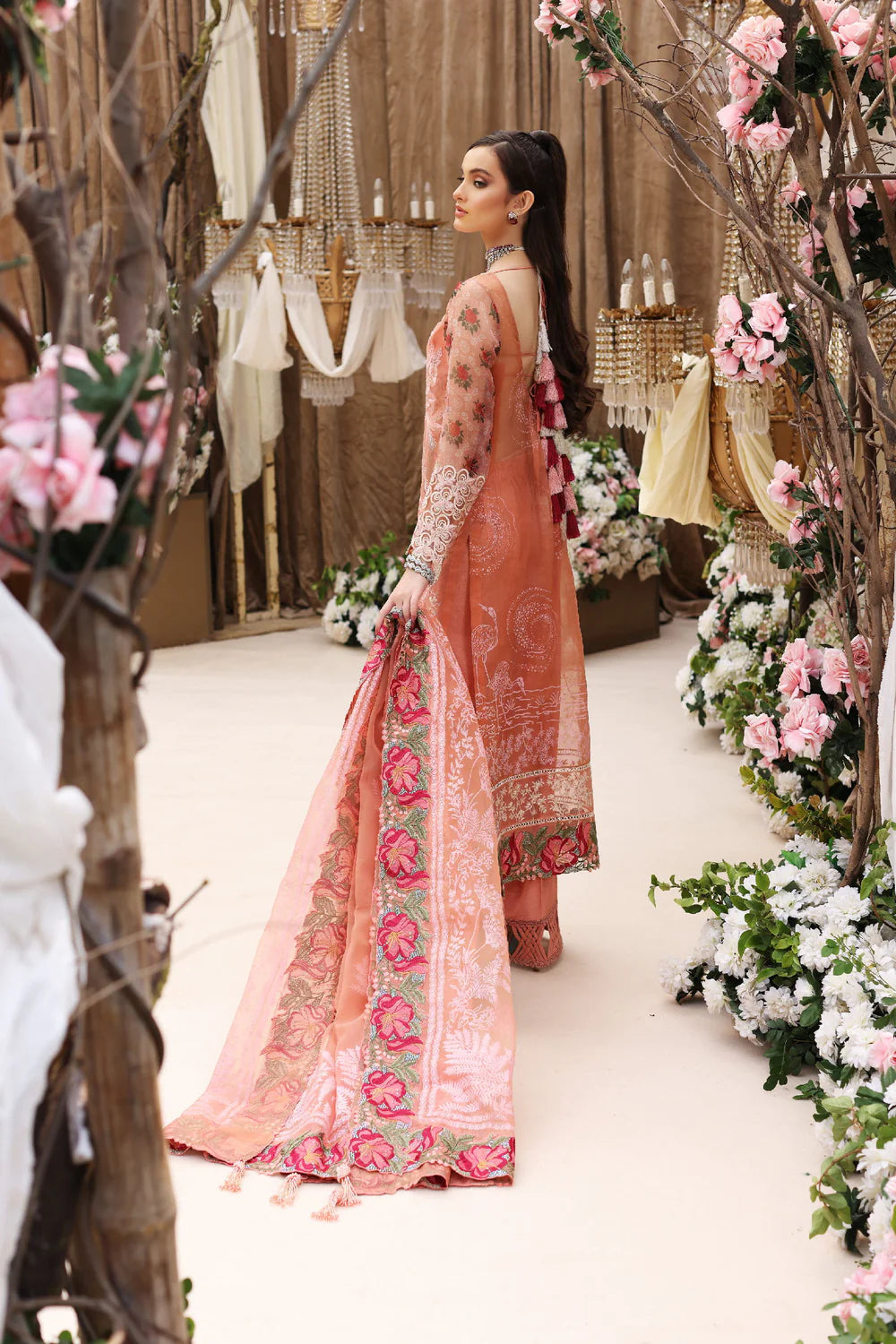 Embroidered front right organza Embroidered left panels organza Embroidered front right panels organza Embroidered left side panels organza Screen printed back organza Embroidered shirt back border organza Printed sleeves organza Embroidered sleeves border Embroidered neck line organza Plain lining cotton silk Screen printed dupatta organza Embroidered dupatta border Plain trouser raw silk