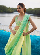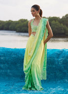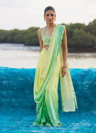 The nostalgic silhouette of a timeless saree is given a contemporary twist with a whimsical ombre digital print. A tangy lemon hue hue flows seamlessly into a citrusy green with a subtle print, making the saree utterly gorgeous. The saree is paired with a sumptuous green blouse, cut from pure raw silk. The blouse is fully hand worked with sequins and Swarovski crystals.