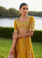 A vision of luminous elegance — this saffron yellow lehnga choli is designed to command attention with its rich craftsmanship and jubilant palette.