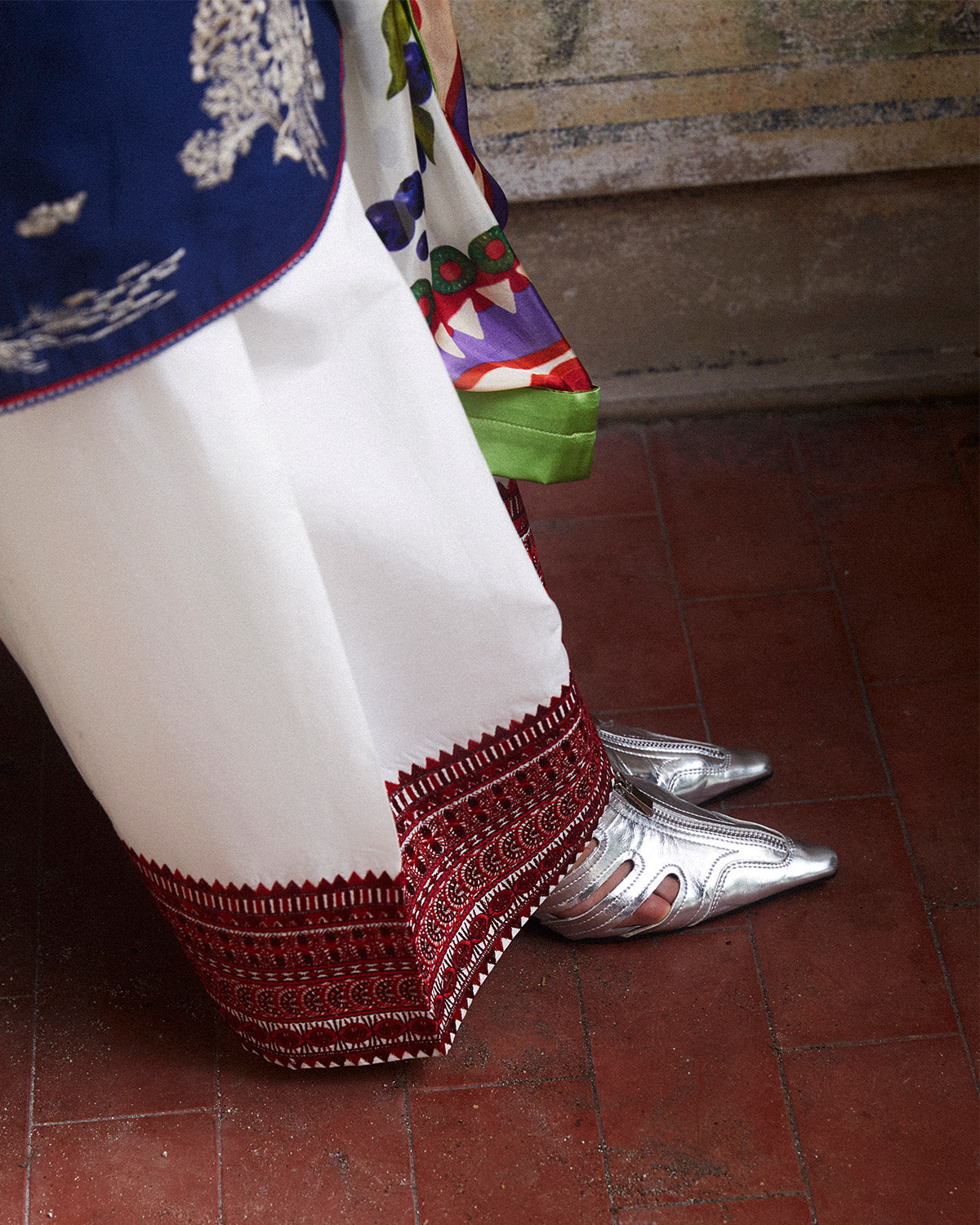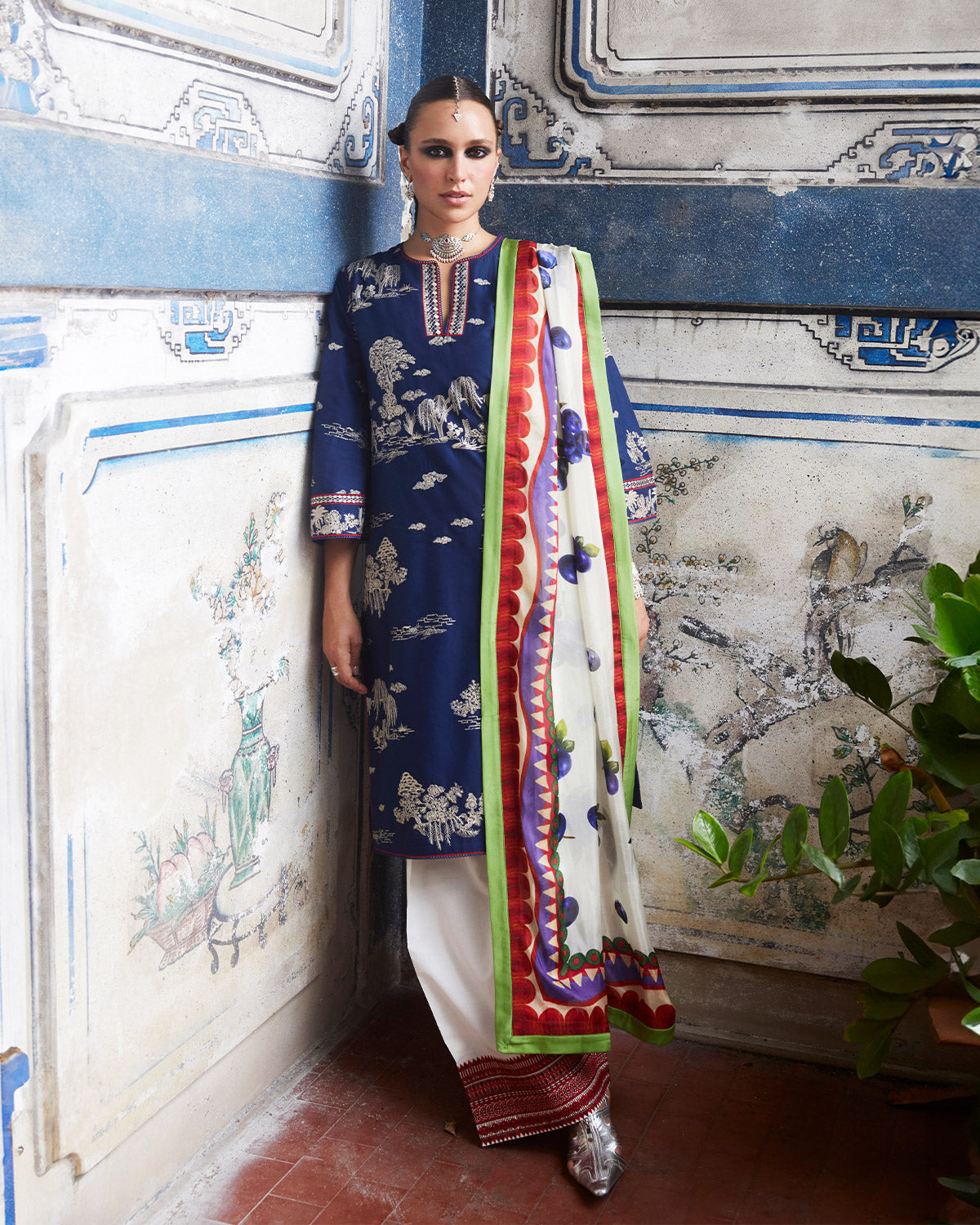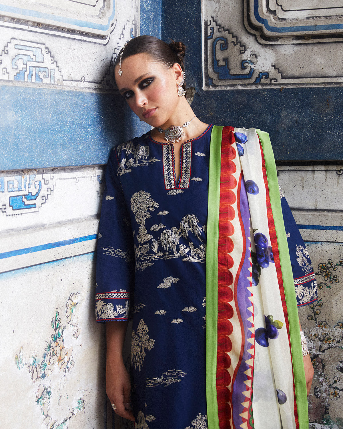 Product Description: A dark blue kurta delicately embroidered in ivory, highlighting intricate details on the neckline and sleeves, perfectly complemented by an ivory shalwar adorned with vibrant red accents. Elevate the ensemble with a silk dupatta adorned with blueberries and an abstract border, adding a whimsical touch to the look.