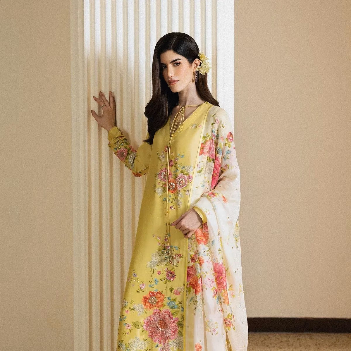 Crafted in rich teal dobby lawn, Mishya is a refined expression of effortless elegance. The intricately detailed shirt pairs beautifully with a structured cambric trouser, creating a balanced and polished silhouette. Finished with a lightweight chiffon dupatta, this ensemble is perfect for elevated daywear and intimate festive moments.