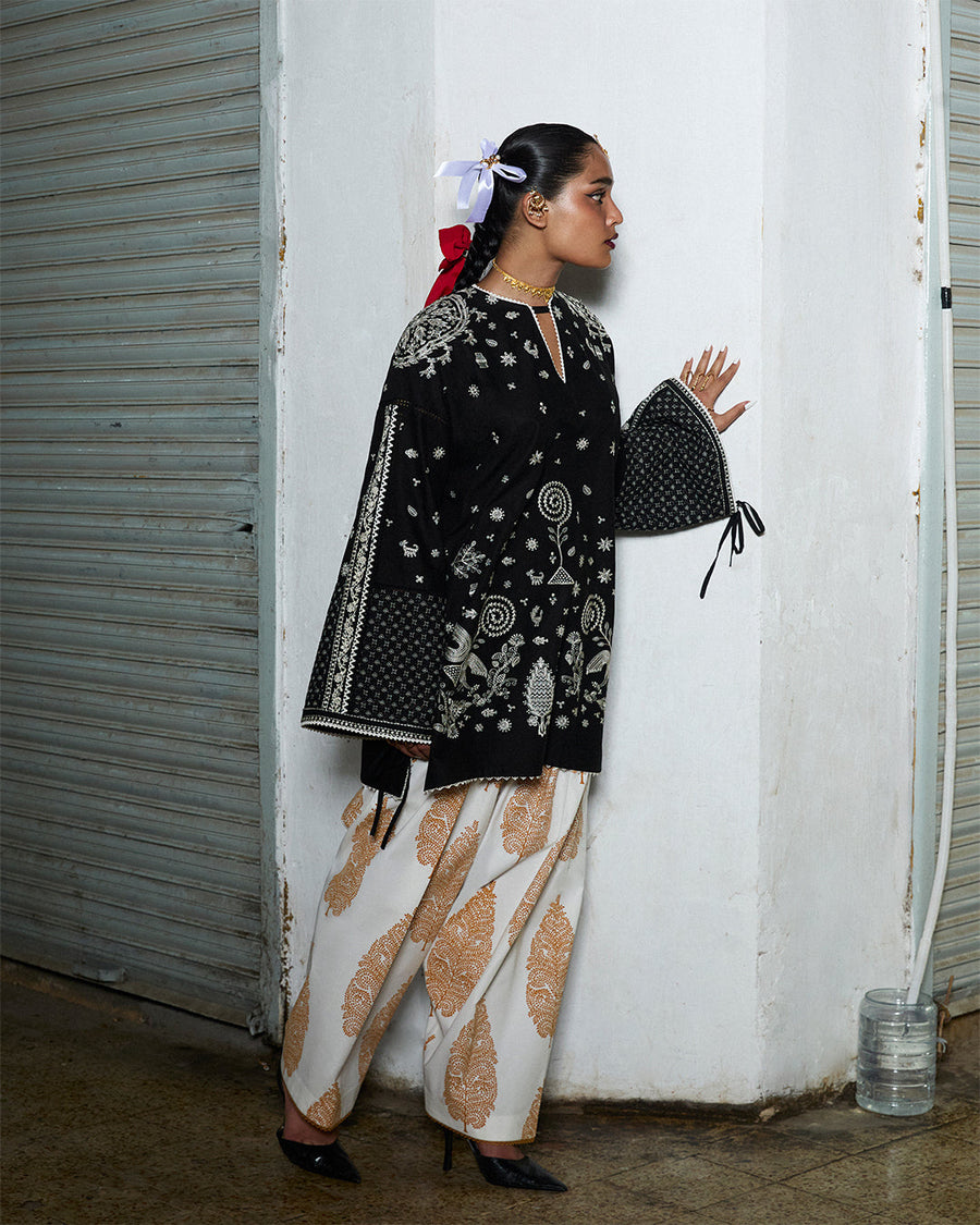 Description: Effortless drama in black and ivory — this short shirt features monochrome embroidery with bell sleeves cinched by drawstrings. Paired with a screen-printed ivory shalwar, it’s a blend of modern structure and traditional artistry.