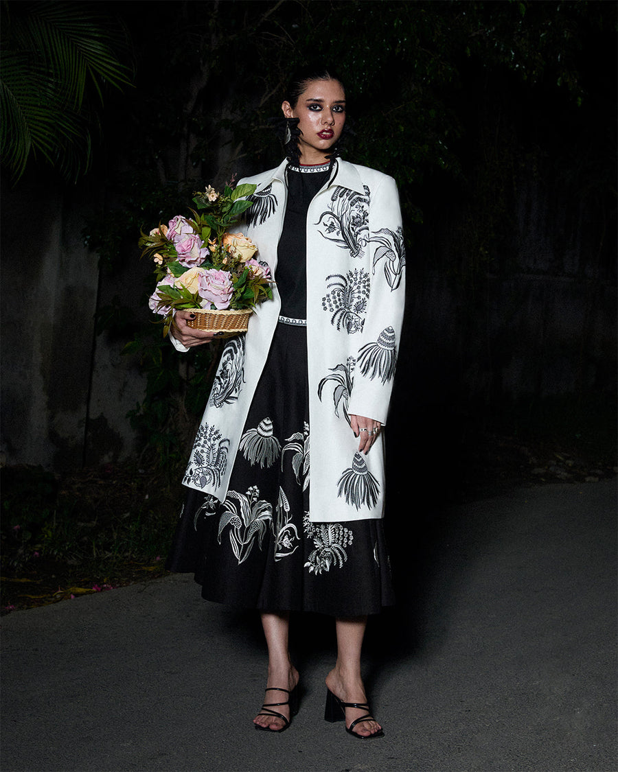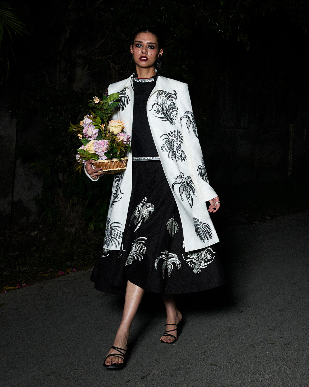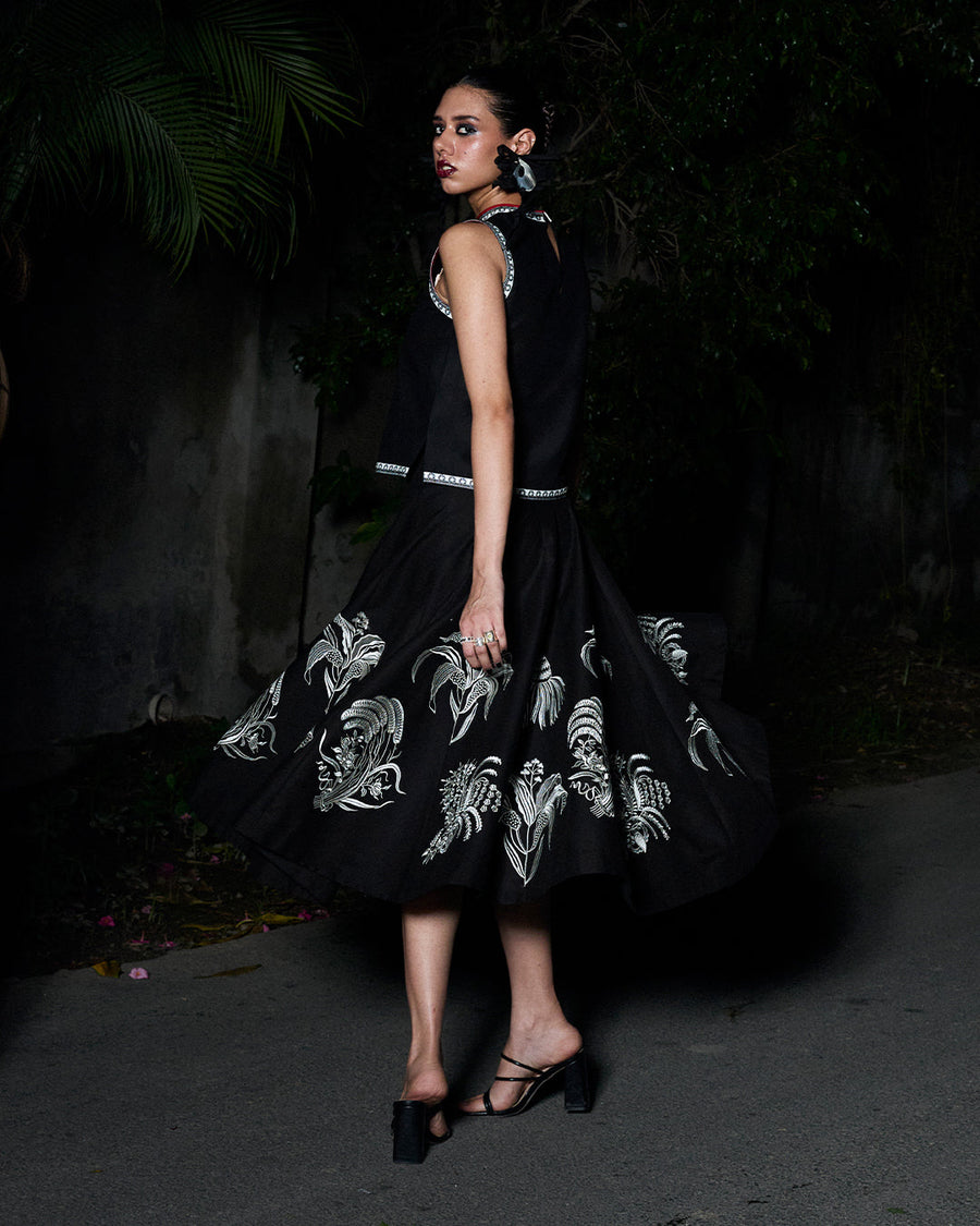 Description: Sharp yet feminine, this sleeveless black top is detailed with tonal embroidery and paired with a monochrome embroidered skirt, offering structure with a touch of softness.