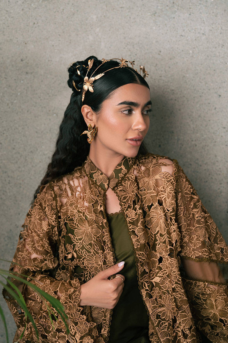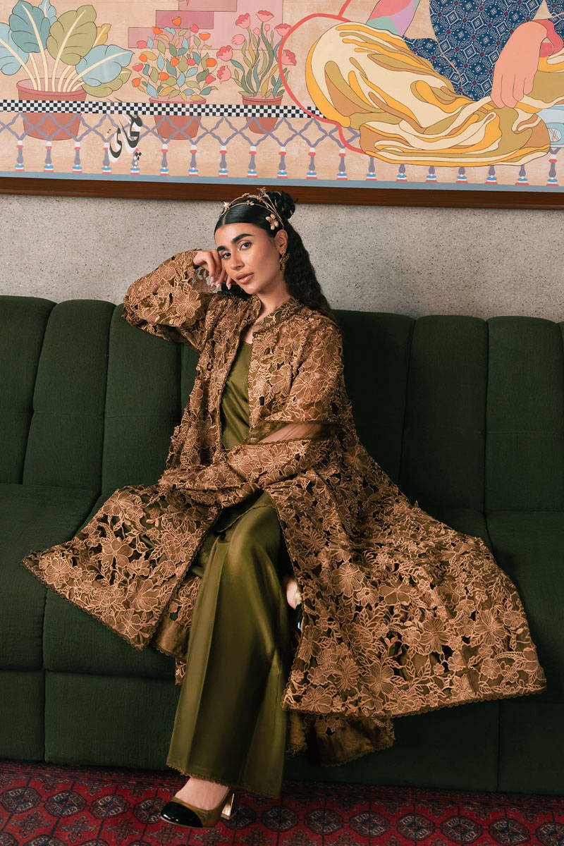 Unveil the opulence of Mohsin Naveed Ranjha's "Mystic Pine" from the Chaye Coffee Luxury Pret Collection. This stunning ensemble, in rich pine green and lustrous bronze gold, is composed of a jacket, inner shirt, and pants. The laser-cut, multi-head embroidered gown showcases a meadow of wildflowers in radiant gold, creating an enchanting visual. The front-open jacket, free of fastenings, reveals a sleek raw silk sleeveless inner shirt in deep pine green. Paired with boot cut trousers hemmed with delicate trims.