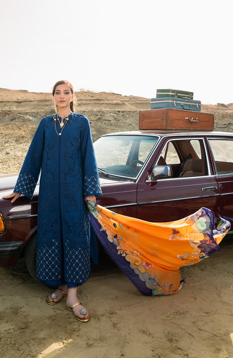 Made for dazzling summer Gatherings, this navy shirt with laser cut is a work of art! Featuring playful geometry and floral laser-cut motifs, it creates a stunning layered effect. The jaali-bordered cambric pants add an extra touch of detail, while the vibrant slub silk dupatta—splashed with sunset hues —brings the perfect pop of color!
