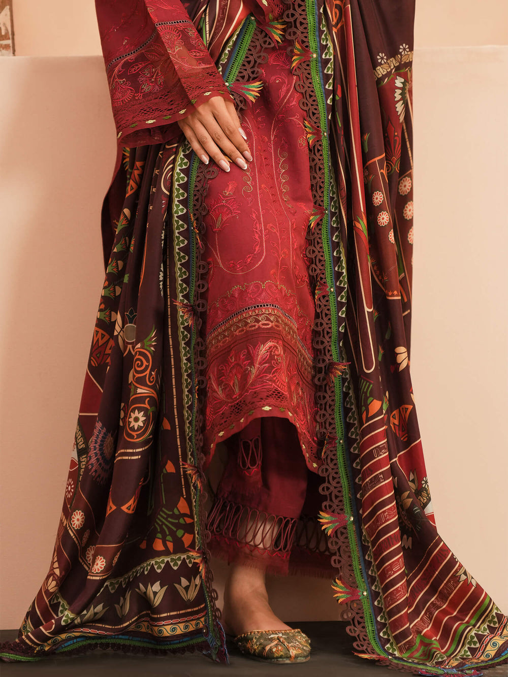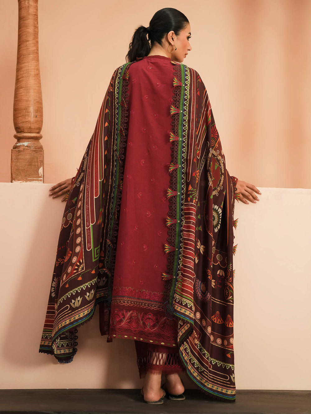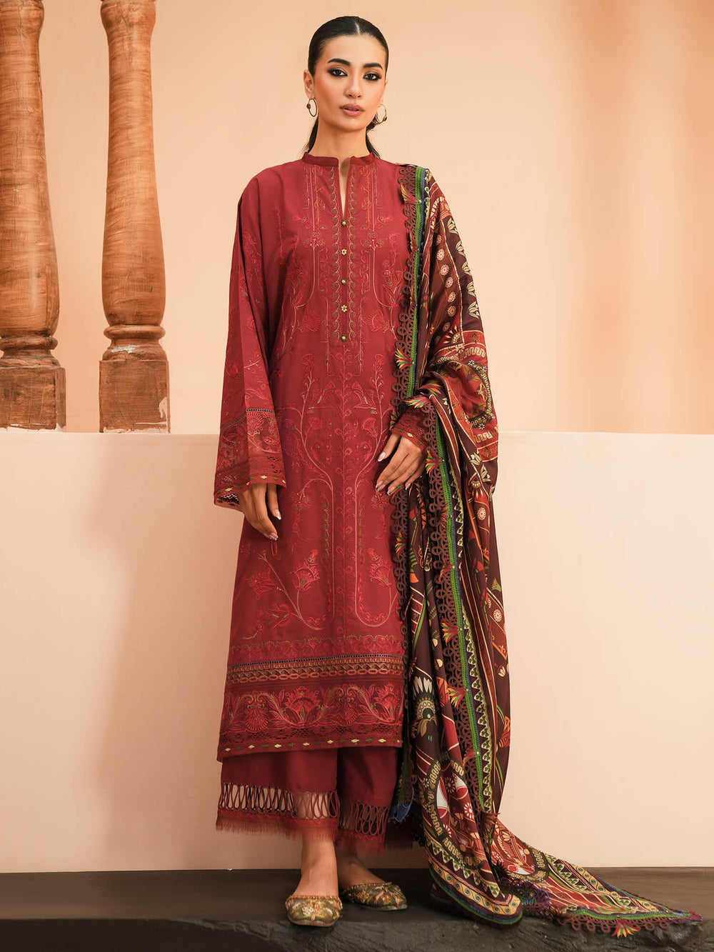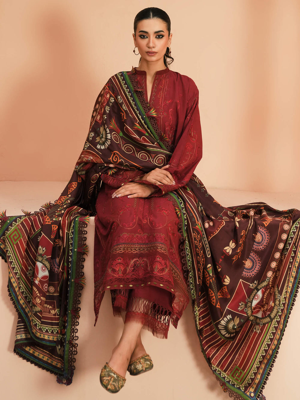 Noaf draws inspiration from Egyptian architecture, featuring a dark maroon silk canvas adorned with ornamental designs that reflect the tales of an ancient kingdom. It is paired with a bright crimson embroidered shirt, mirroring the same symmetrical pattern philosophy.