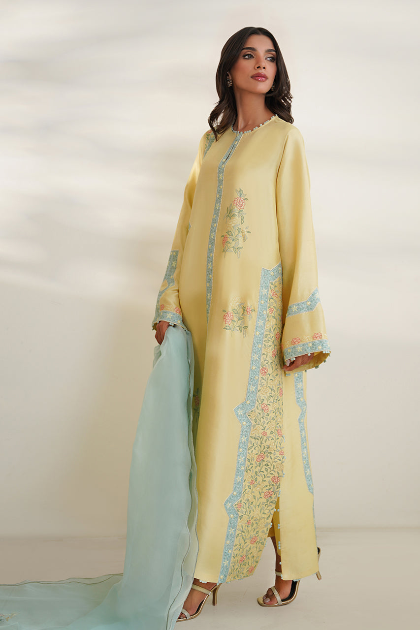 A pastel yellow tunic cut from pure rawsilk is delicately adorned with floral embroidery. Paired with an elegant powder blue organza dupatta with scalloped edges and appliquéd accents. Complete the ensemble with matching rawsilk culottes.