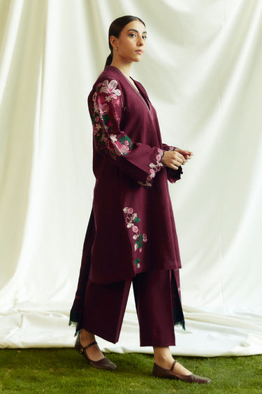 This Kaleji shirt featuring subtle citrus accents is a statement on its own. Pair it with this embroidered shalwar and shawl for your winter dinners.
